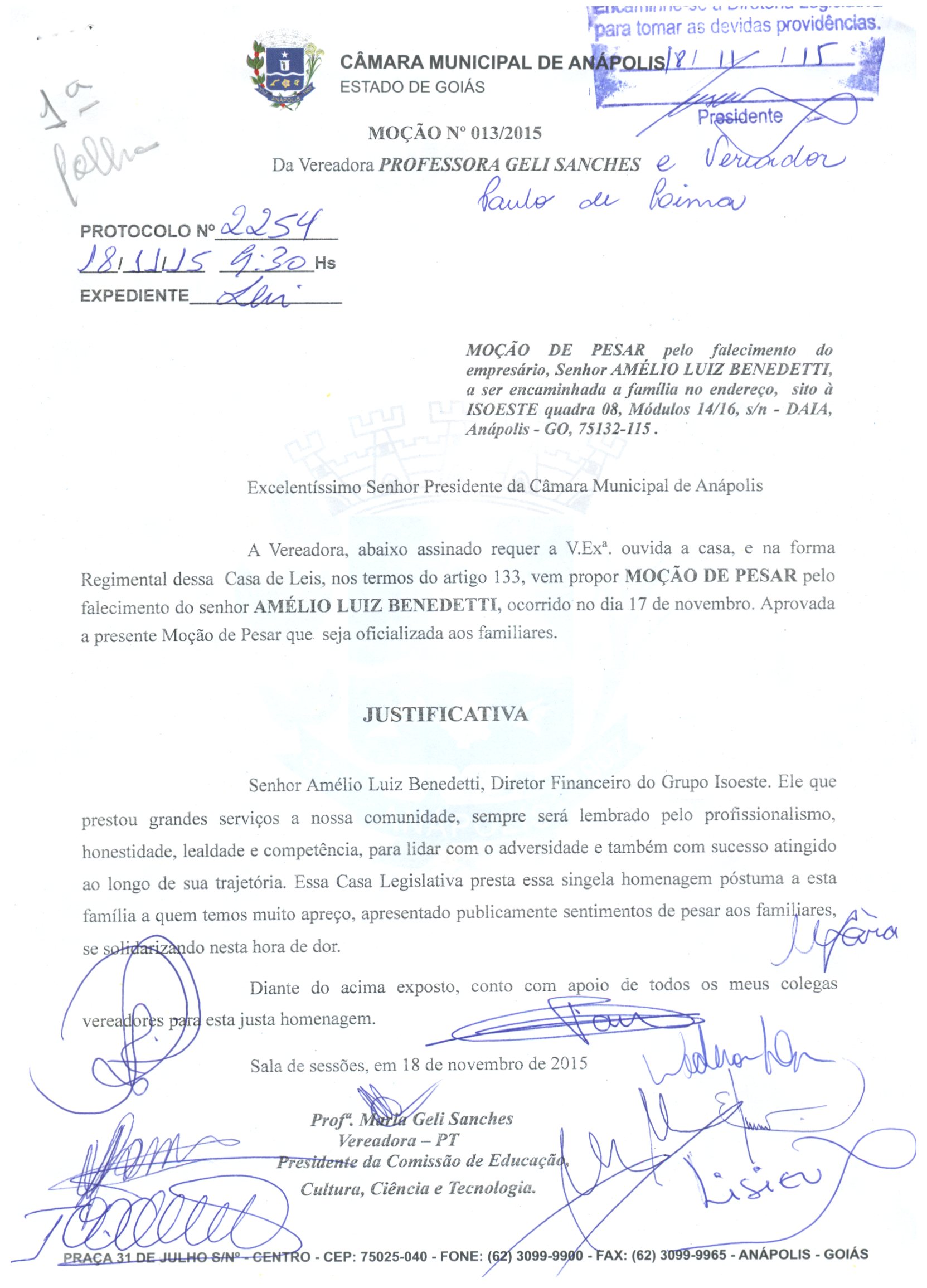 Ementa: À FAMÍLIA DO FALECIDO EMPRESÁRIO SR. AMÉLIO LUIZ BENEDETTI.