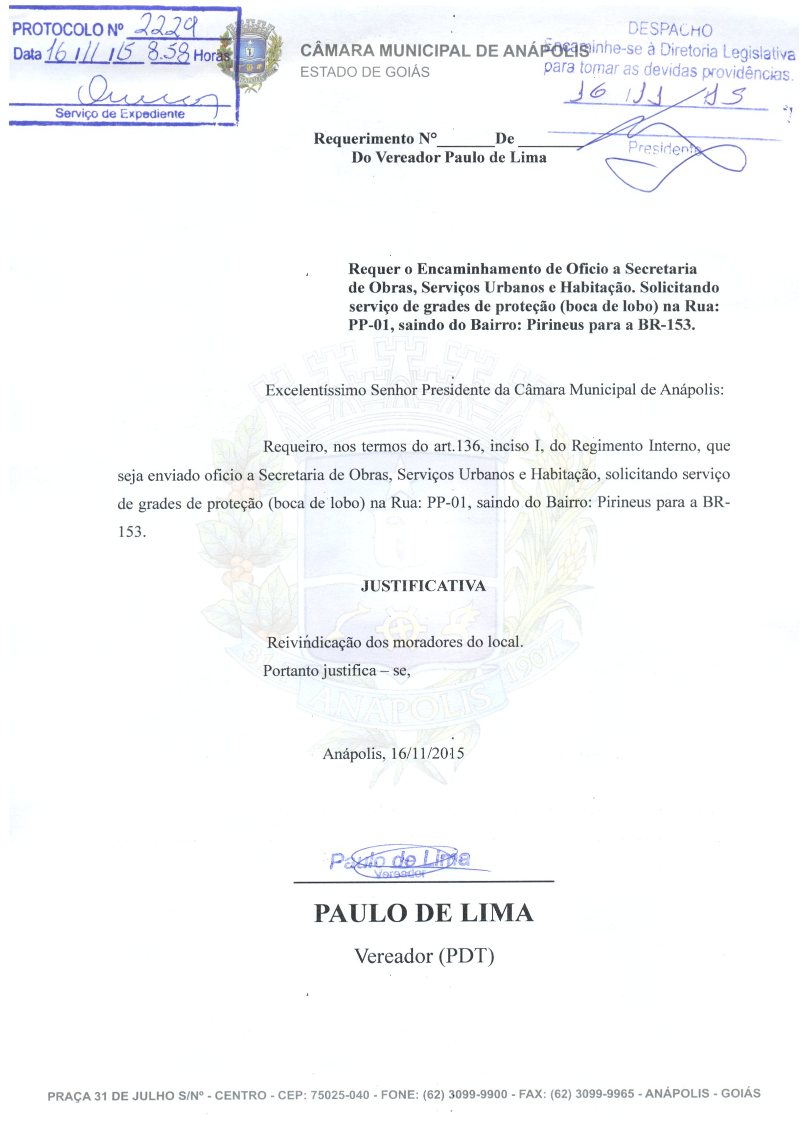 Ementa: À SECRETARIA DE OBRAS, SERVIÇOS URBANOS E HABITAÇÃO, SOLICITANDO SERVIÇO DE GRADES DE PROTEÇÃO (BOCA DE LOBO) NA RUA PP-01, SAINDO DO BAIRRO PIRINEUS PARA A BR-153.