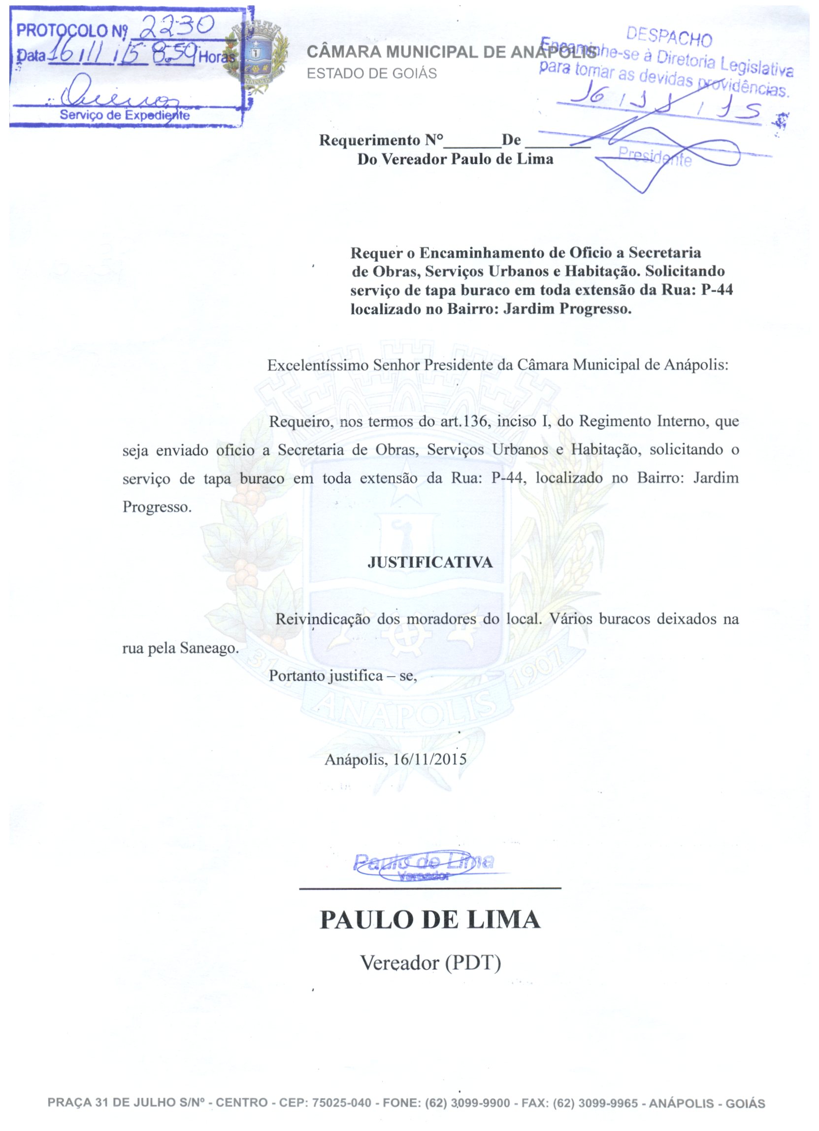 Ementa: À SECRETARIA DE OBRAS, SERVIÇOS URBANOS E HABITAÇÃO, SOLICITANDO O SERVIÇO DE TAPA BURACO EM TODA A EXTENSÃO DA RUA P-44, LOCALIZADO NO BAIRRO JARDIM PROGRESSO.