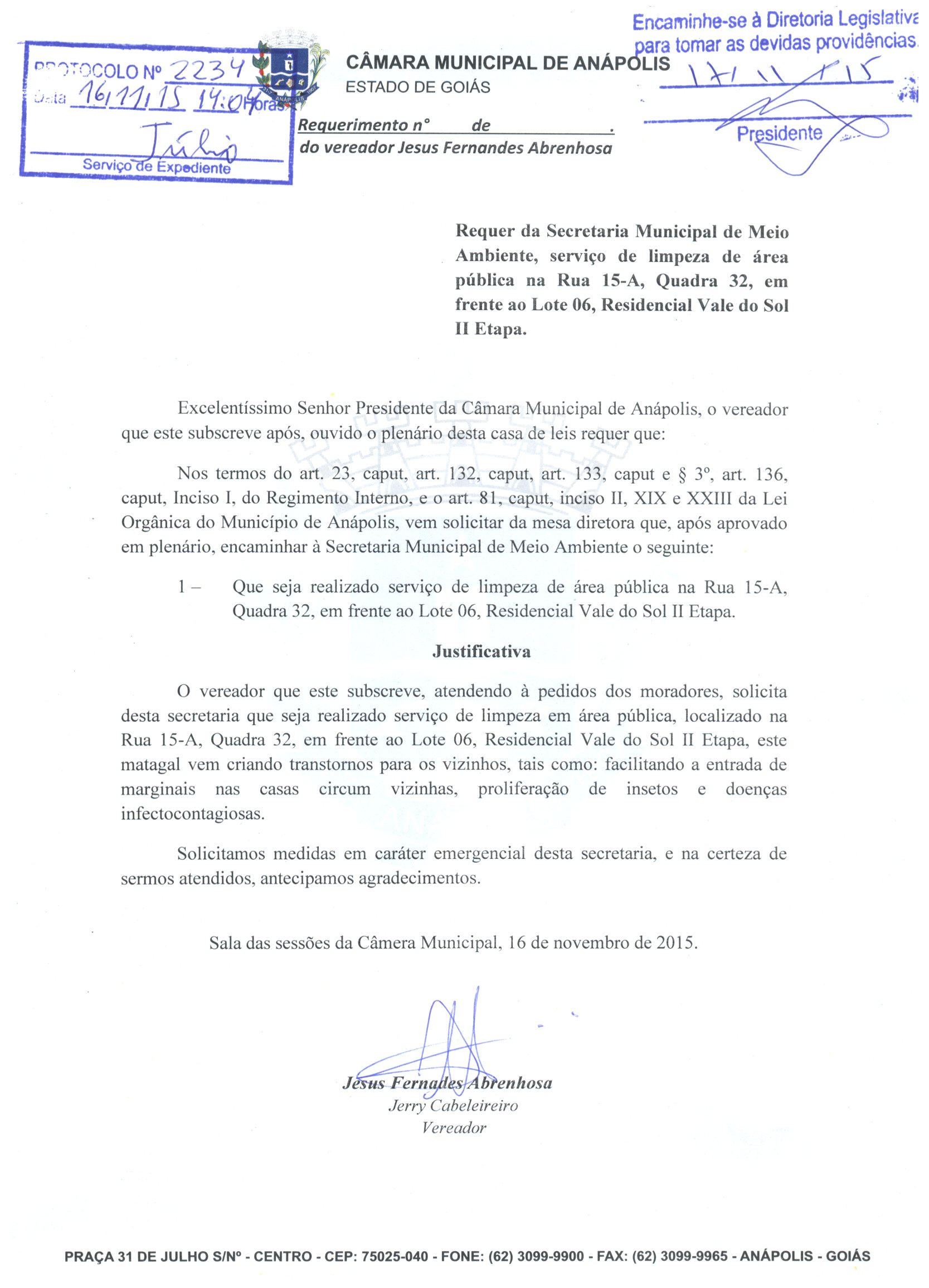 Ementa: À SECRETARIA MUNICIPAL DO MEIO AMBIENTE, SOLICITANDO O SERVIÇO DE LIMPEZA DE ÁREA PÚBLICA NA RUA 15-A, QD. 32, L. 06, NO RESIDENCIAL VALE DO SOL, SEGUNDA ETAPA.