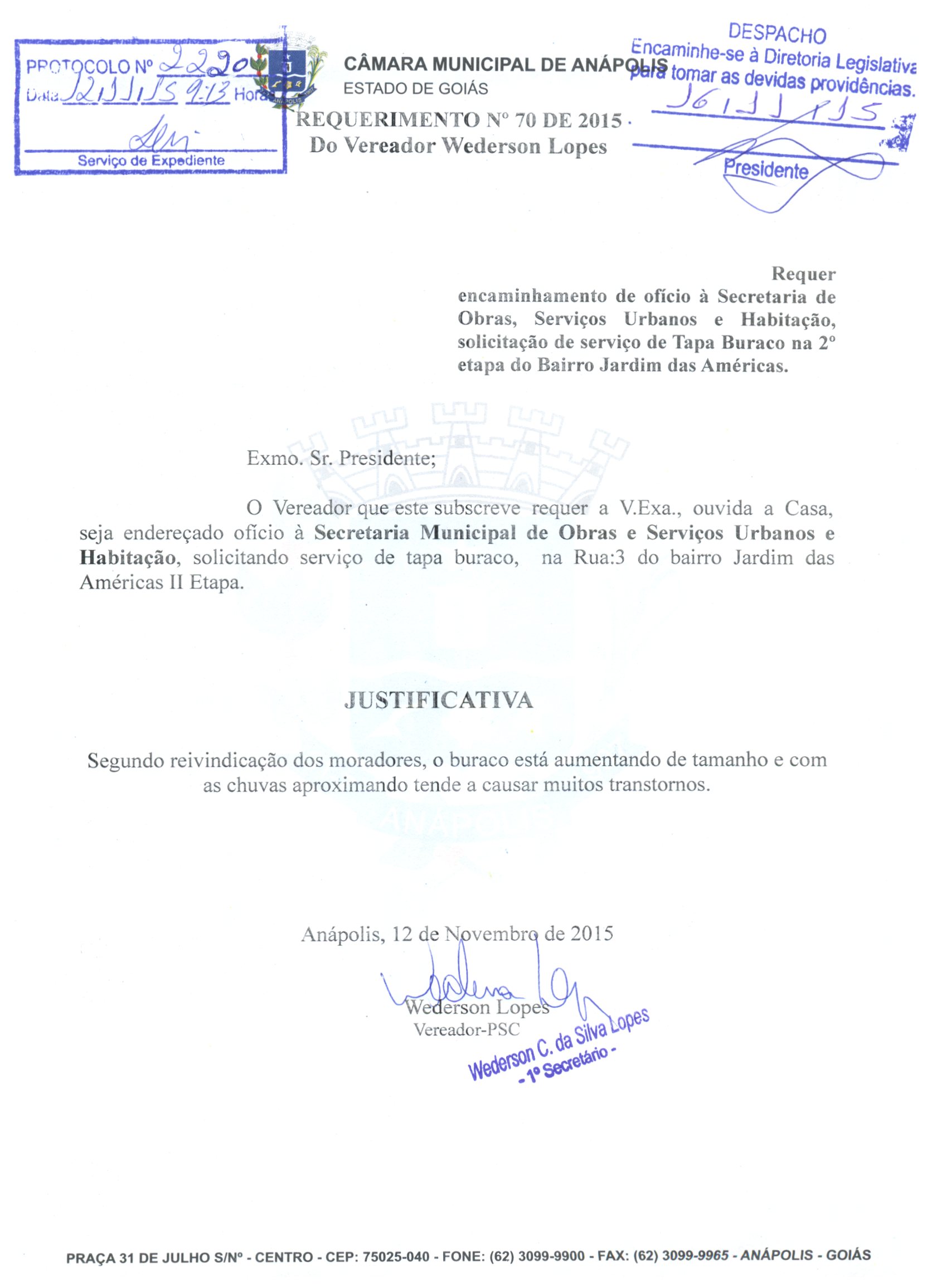 Ementa: À SECRETARIA MUNICIPAL DE DESENVOLVIMENTO URBANO SOLICITANDO O SERVIÇO DE TAPA-BURACO NA AV. PEDRO LUDOVICO N° 1871, NO BAIRRO SÃO JOAQUIM, E TAMBÉM NA ESQUINA COM A RUA QUINTINO BOCAÚVA, NO CENTRO.