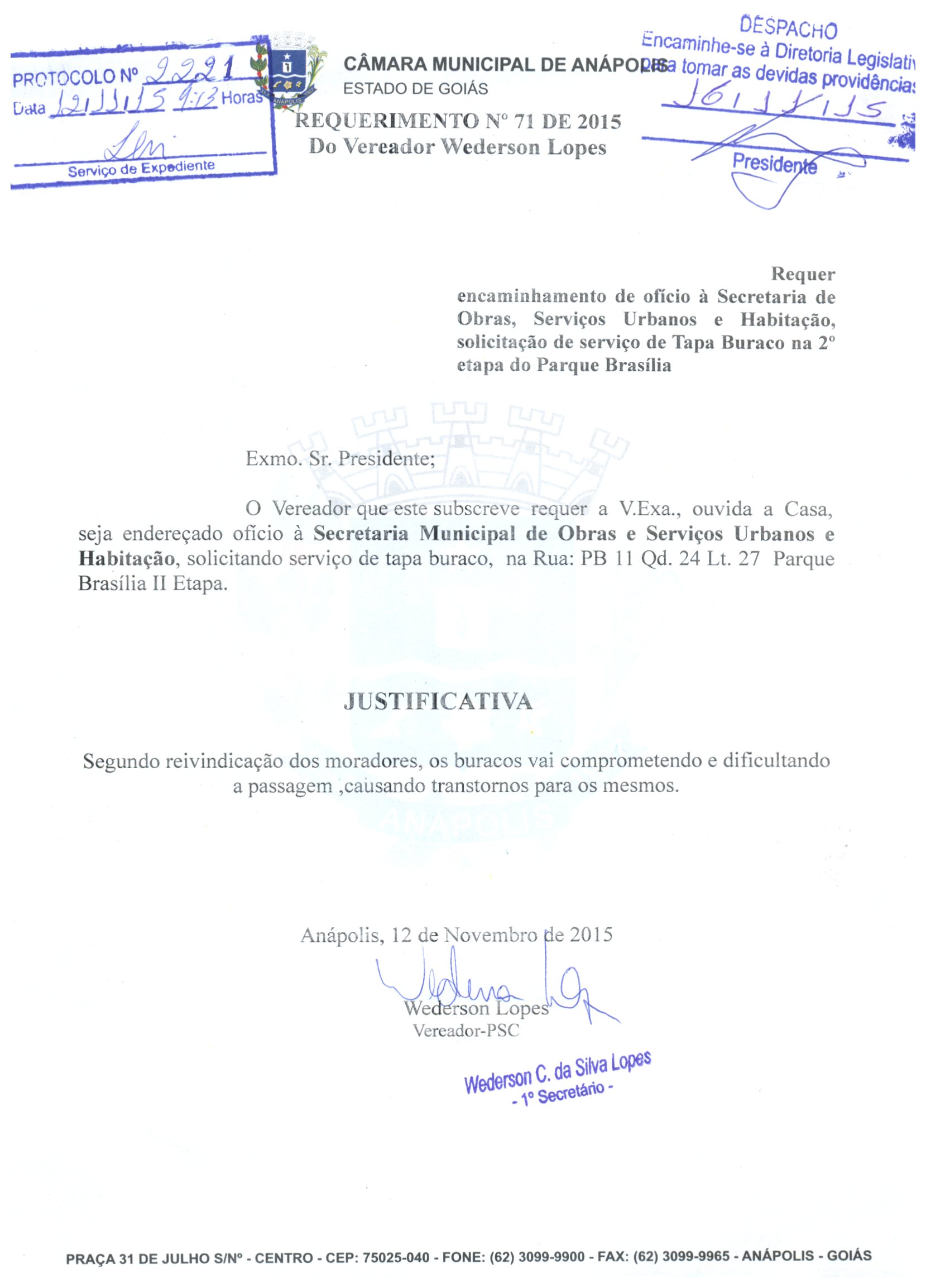 Ementa: À SECRETARIA MUNICIPAL DE OBRAS, SERVIÇOS URBANOS E HABITAÇÃO, SOLICITANDO O SERVIÇO DE TAPA BURACO NA RUA PB-11, QD. 24, L. 27, NO PARQUE BRASÍLIA, SEGUNDA ETAPA.