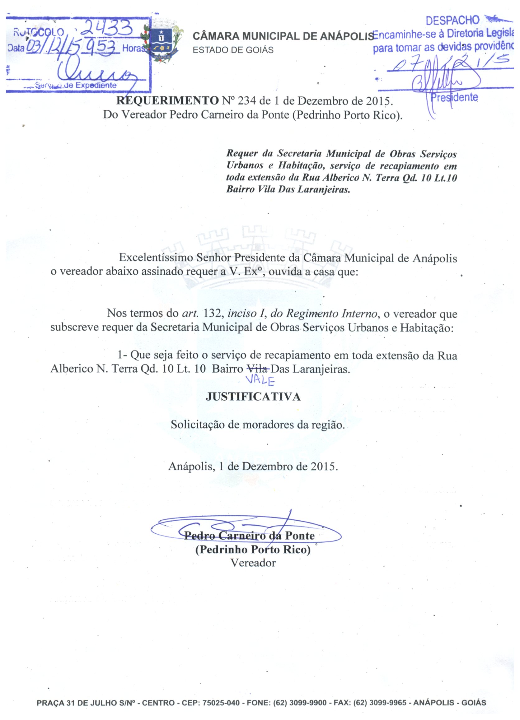 Ementa: À SECRETARIA MUNICIPAL DE OBRAS, SERVIÇOS URBANOS E HABITAÇÃO, SOLICITANDO O SERVIÇO DE RECAPEAMENTO EM TODA A EXTENSÃO DA RUA ALBERICO N. TERRA QD. 10 LT. 10, VILA DAS LARANJEIRAS.