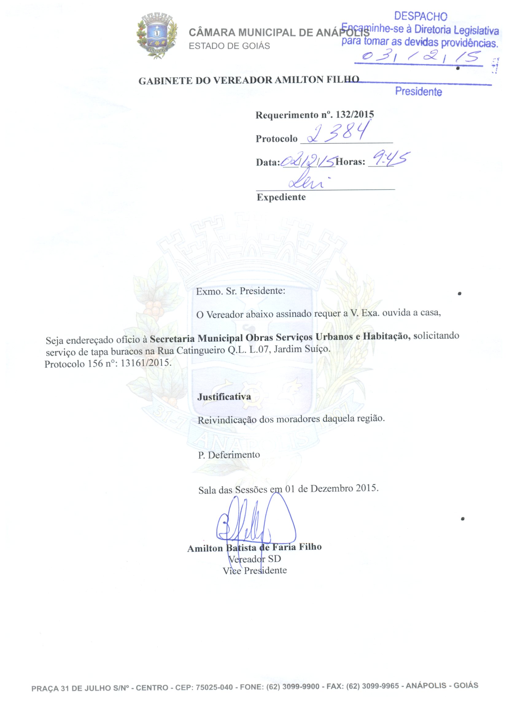 Ementa: À SECRETARIA DE OBRAS, SERVIÇOS URBANOS E HABITAÇÃO, SOLICITANDO O SERVIÇO DE TAPA-BURACO NA RUA CATINGUEIRO QD. L LT. 07, NO JARDIM SUIÇO.