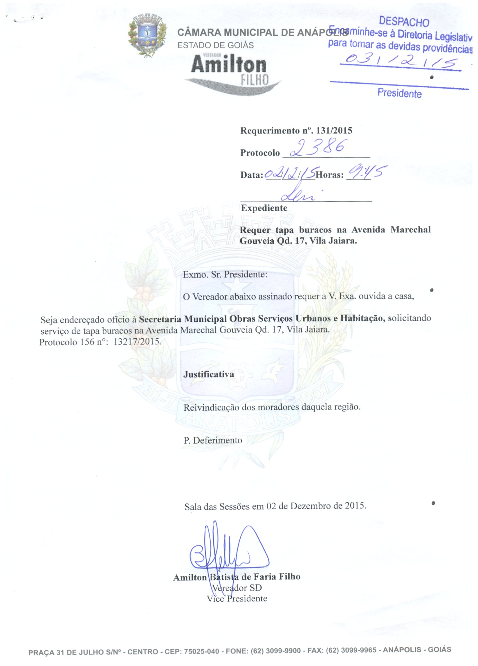 Ementa: À SECRETARIA DE OBRAS, SERVIÇOS URBANOS E HABITAÇÃO, SOLICITANDO O SERVIÇO DE TAPA-BURACO NA AV. MARECHAL GOUVEIA QD. 17, NA VILA JAIARA.