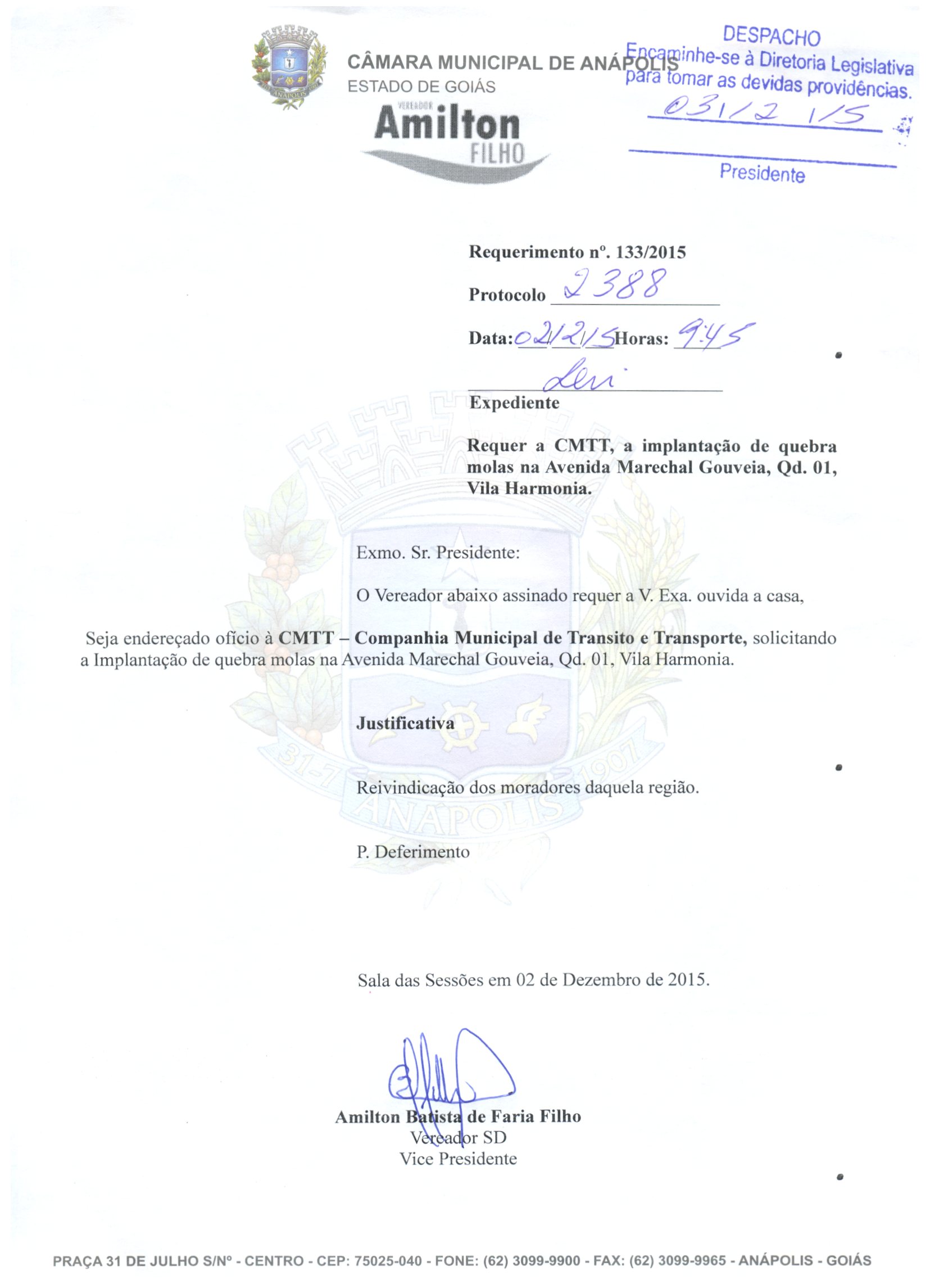 Ementa: À CMTT SOLICITANDO A IMPLANTAÇÃO DE QUEBRA-MOLAS NA AV. MARECHAL GOUVEIA QD. 01, NA VILA HARMONIA.