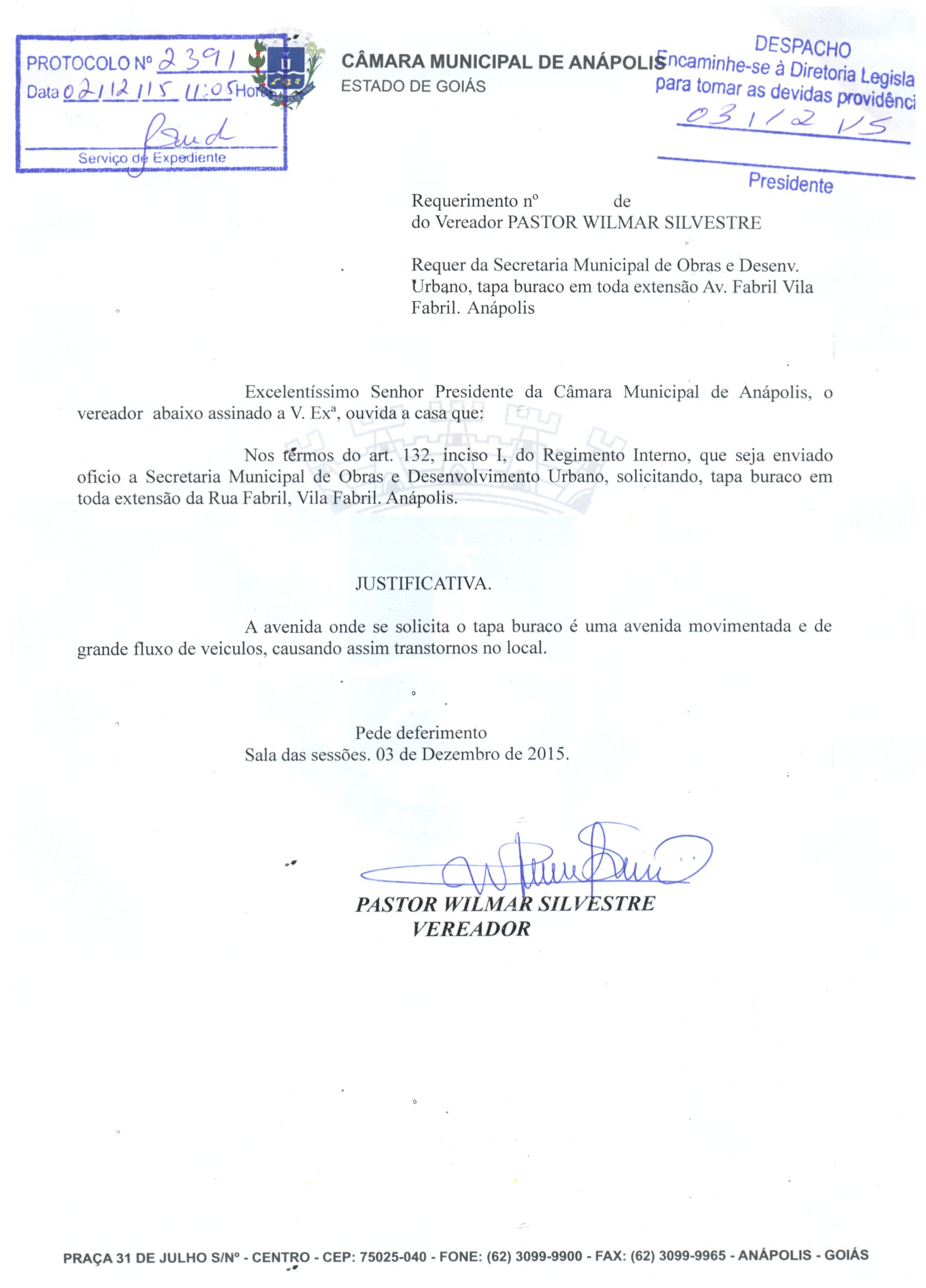 Ementa: À SECRETARIA DE OBRAS, SERVIÇOS URBANOS E HABITAÇÃO, SOLICITANDO O SERVIÇO DE TAPA-BURACO EM TODA A EXTENSÃO DA AV. FABRIL, NA VILA FABRIL.