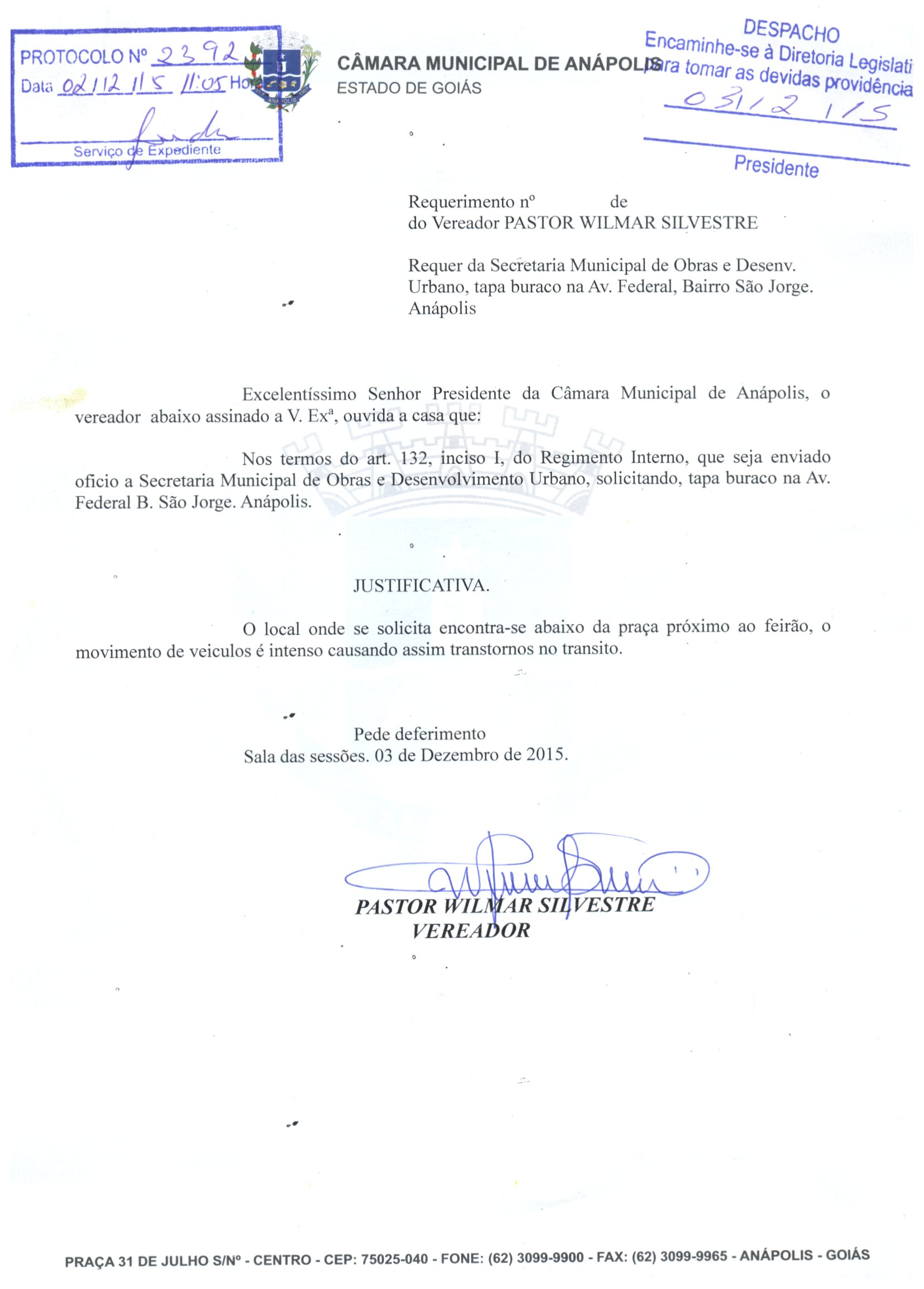 Ementa: À SECRETARIA DE OBRAS, SERVIÇOS URBANOS E HABITAÇÃO, SOLICITANDO O SERVIÇO DE TAPA-BURACO NA AV. FEDERAL, NO BAIRRO SÃO JORGE.