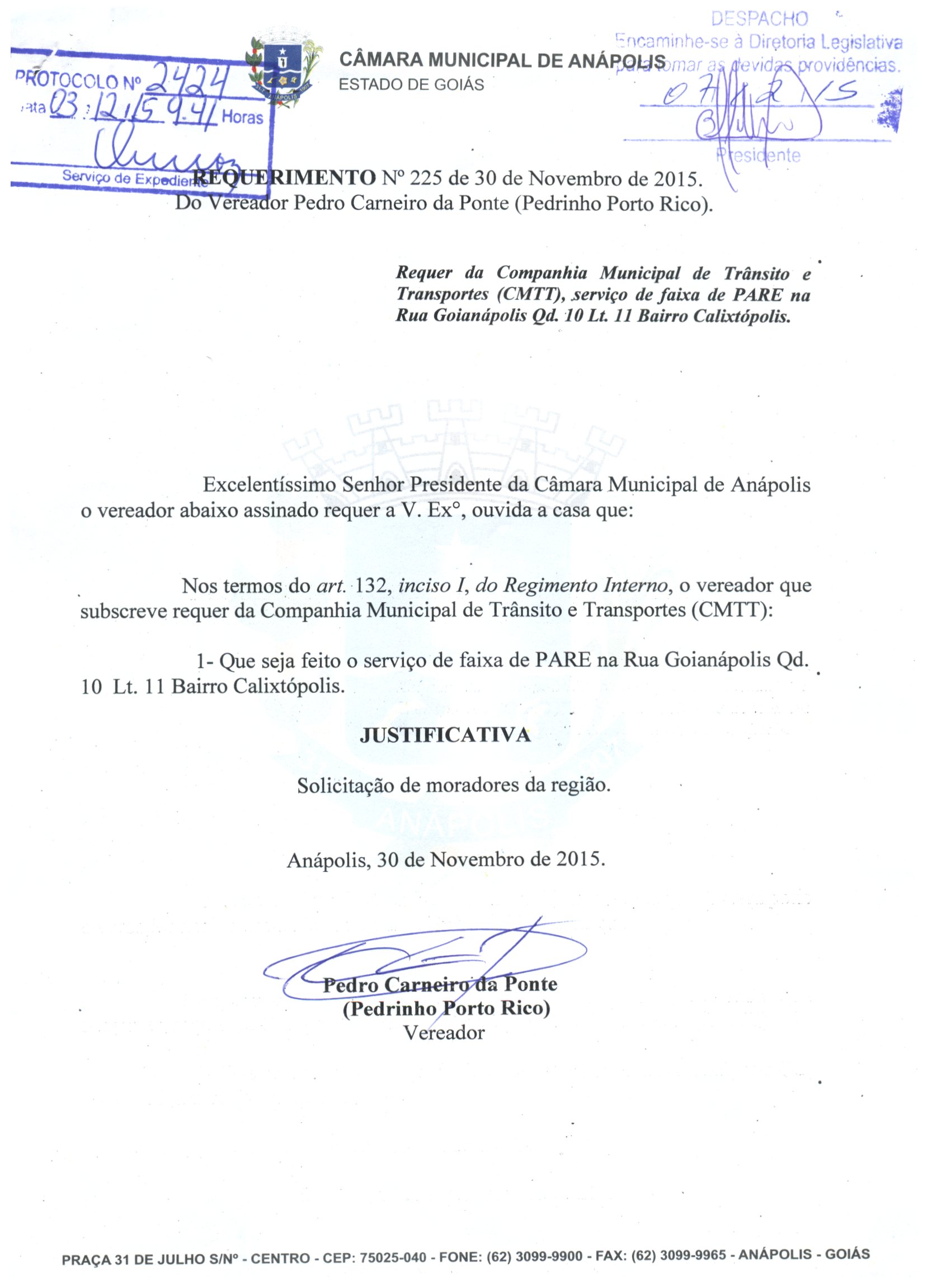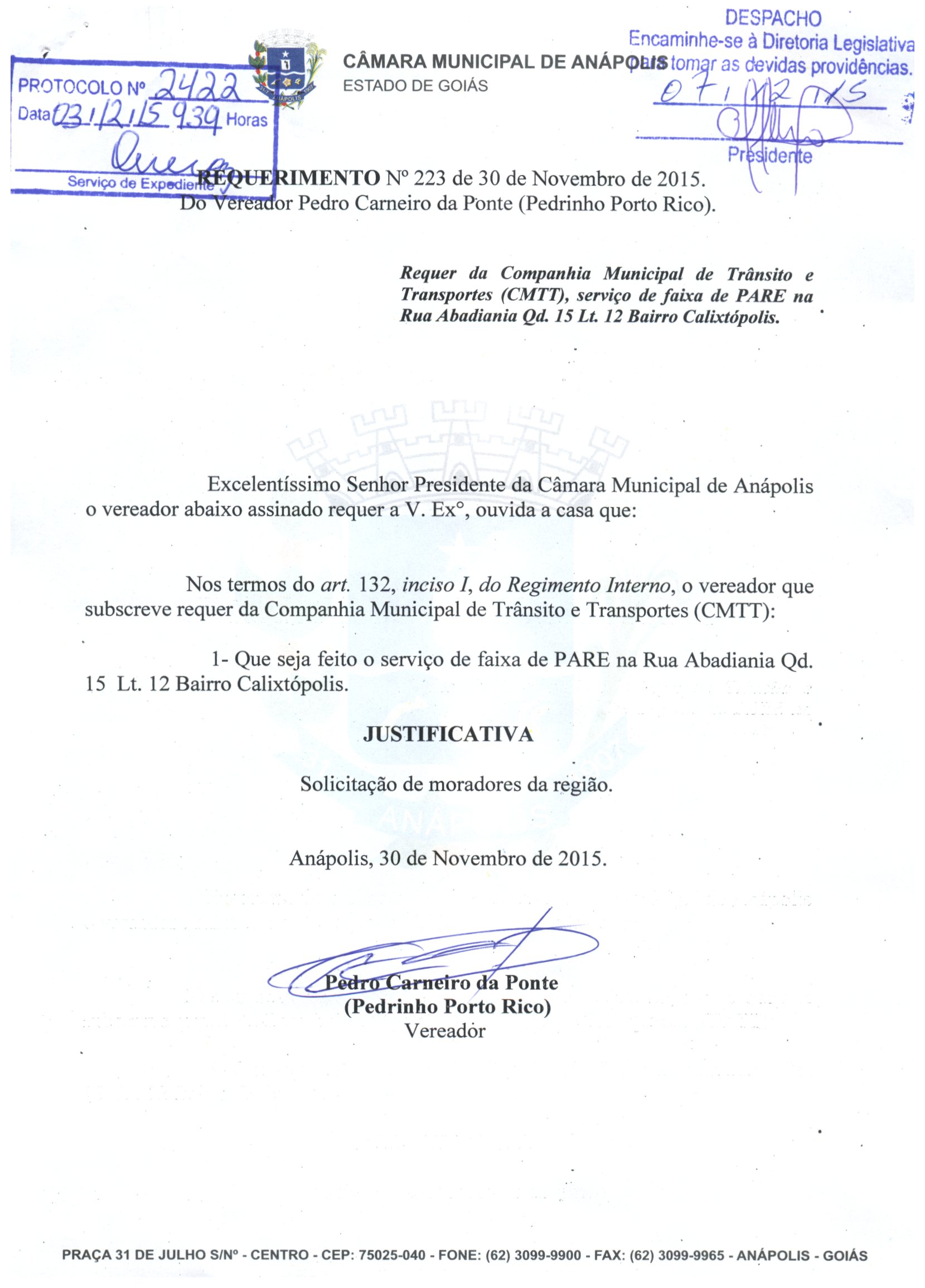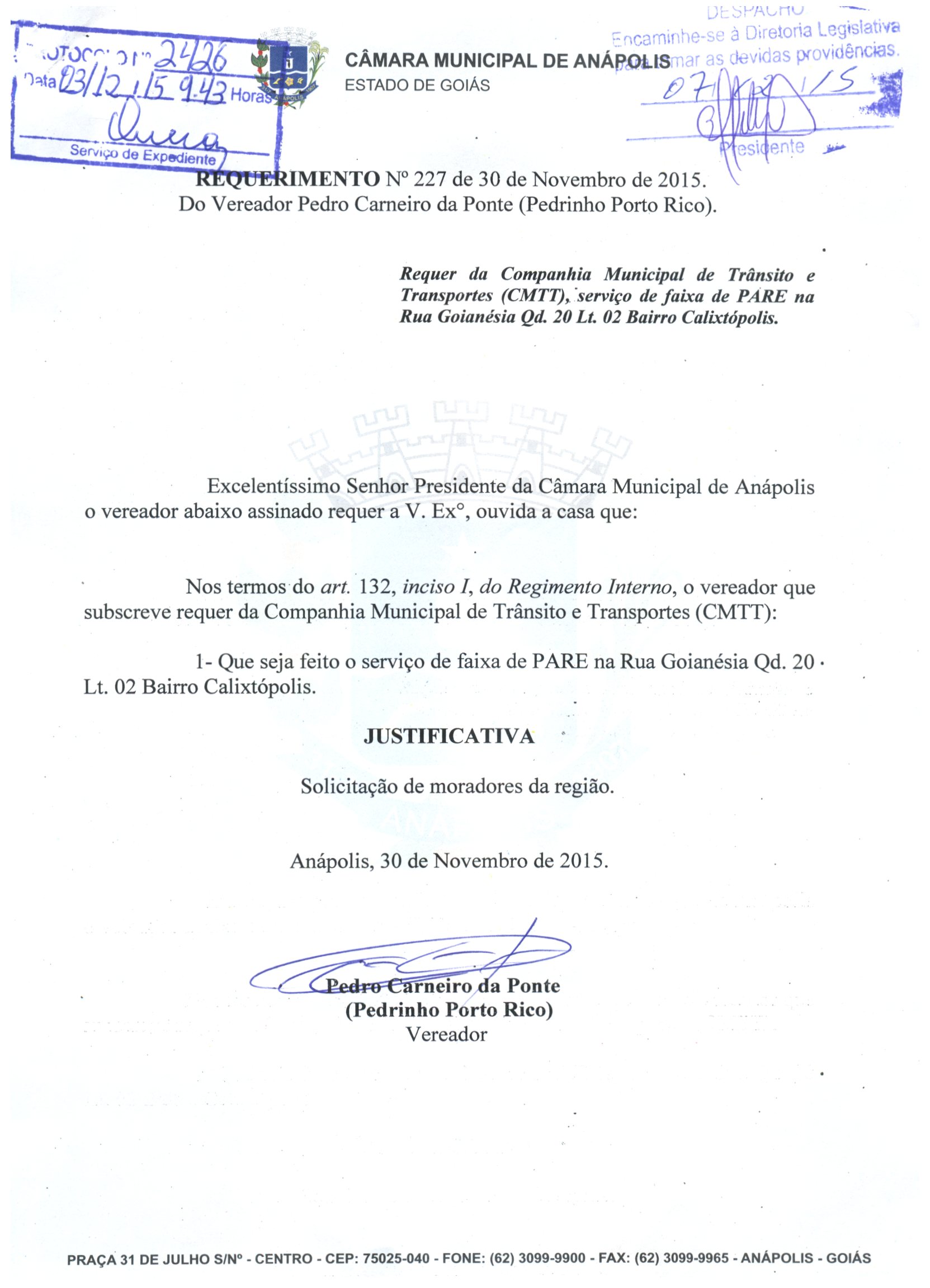 Ementa: AO CMTT,SOLICITANDO O SERVIÇO DE PARE NA RUA GOIANÁPOLIS QD. 10 LT. 11 BAIRRO CALIXTÓPOLIS.