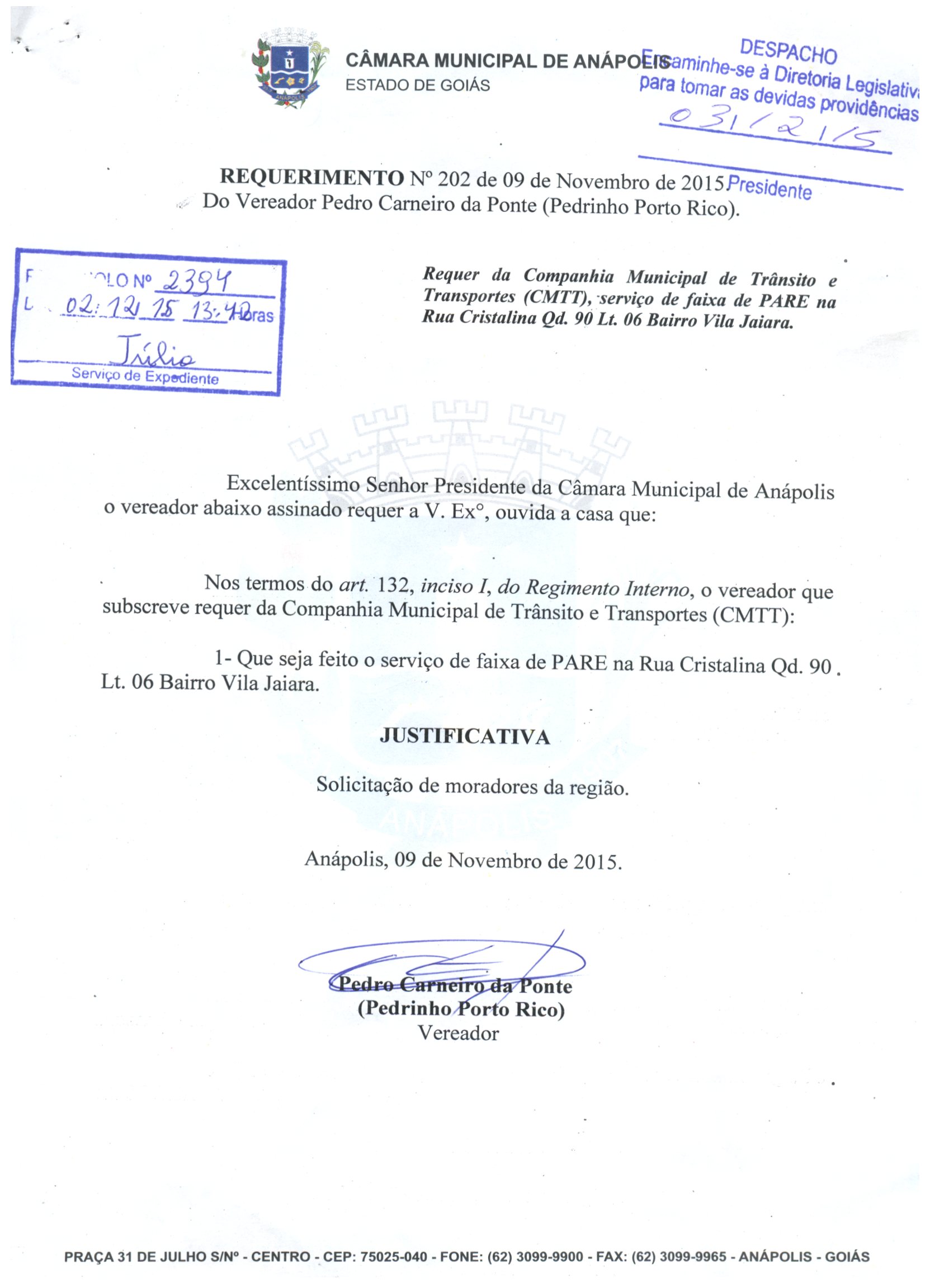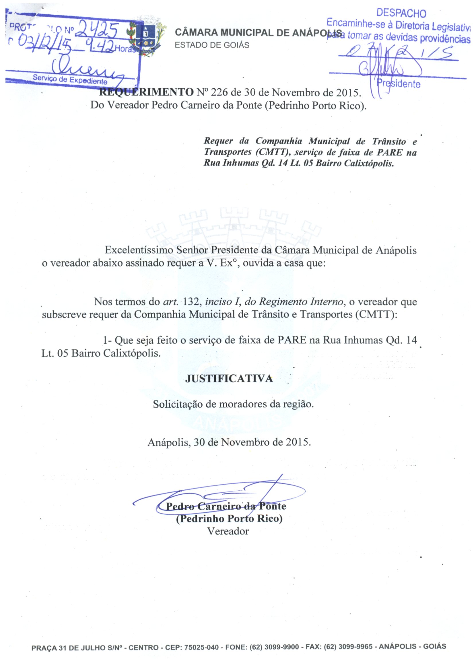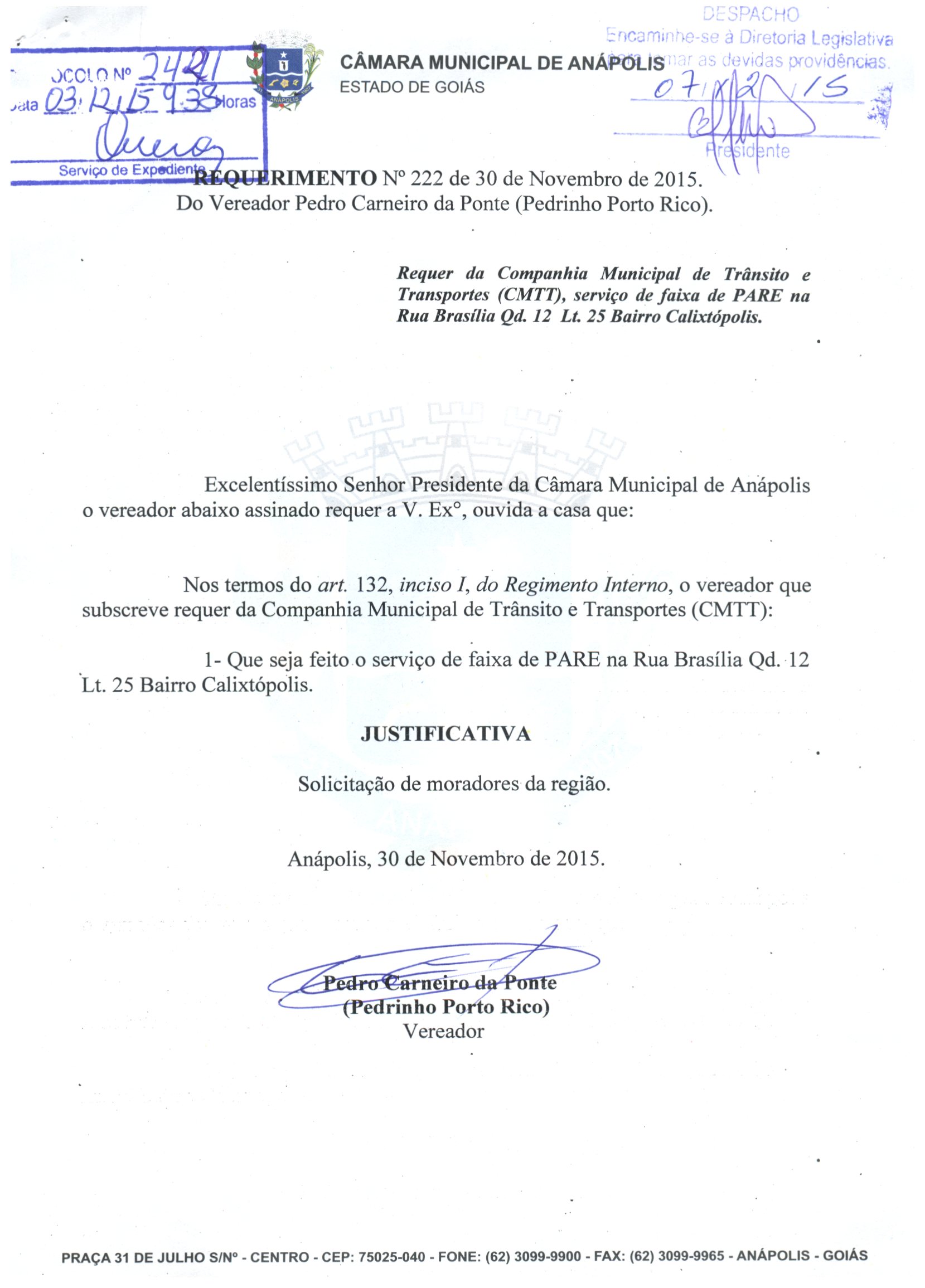 Ementa: AO CMTT,SOLICITANDO O SERVIÇO DE PARE NA RUA GOIANÁPOLIS QD. 10 LT. 11 BAIRRO CALIXTÓPOLIS.