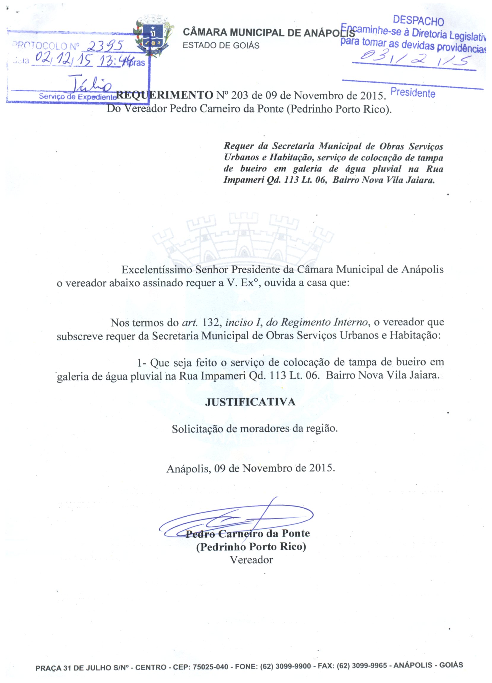 Ementa: À SECRETARIA DE OBRAS, SERVIÇOS URBANOS E HABITAÇÃO, SOLICITANDO A TAPAÇÃO DE BUEIRO EM GALERIA DE ÁGUA PLUVIAL NA RUA IMPAMERI QD. 113 LT. 06, NA NOVA VILA JAIARA.