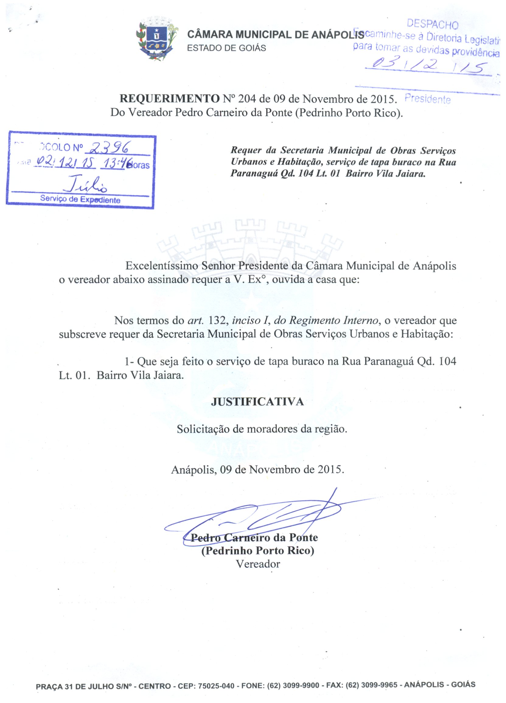 Ementa: À SECRETARIA DE OBRAS, SERVIÇOS URBANOS E HABITAÇÃO, SOLICITANDO O SERVIÇO DE TAPA-BURACO NA RUA PARANAGUÁ QD. 104 LT. 01, NA VILA JAIARA.
