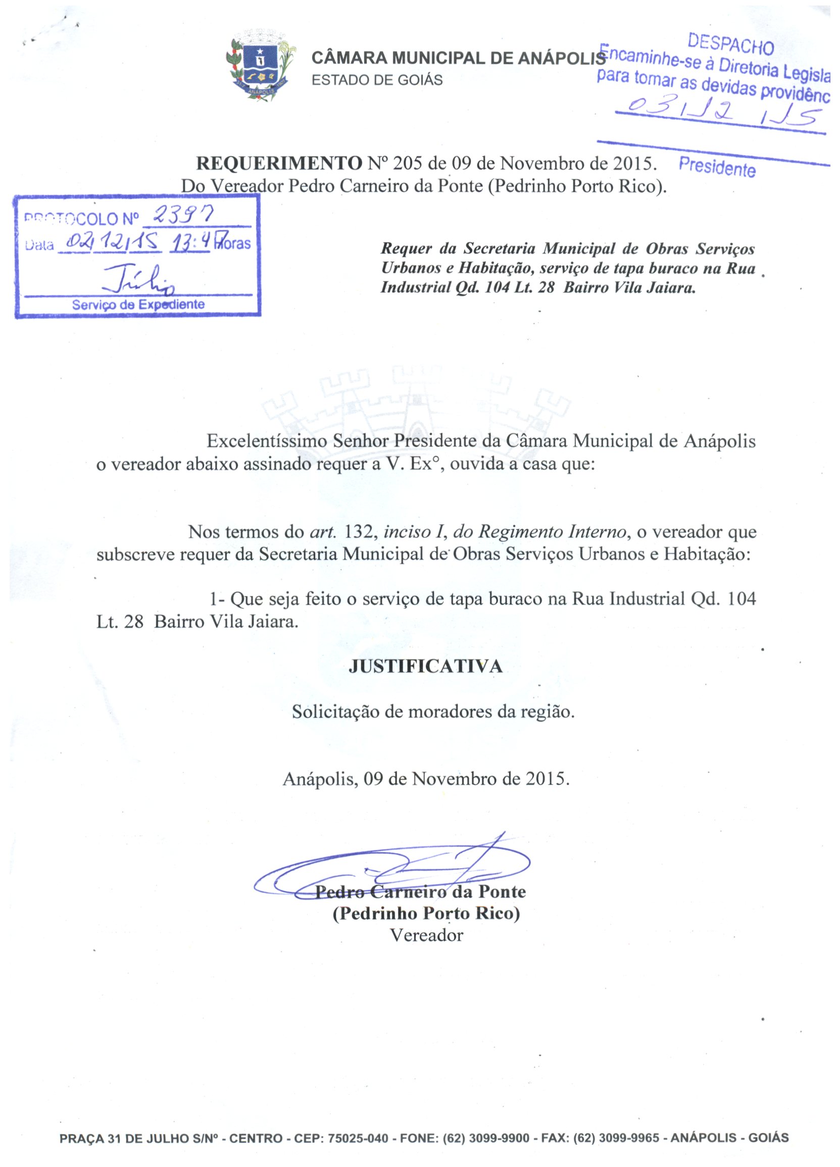 Ementa: À SECRETARIA DE OBRAS, SERVIÇOS URBANOS E HABITAÇÃO, SOLICITANDO O SERVIÇO DE TAPA-BURACO NA RUA INDUSTRIAL QD. 104 LT. 28, NA VILA JAIARA.