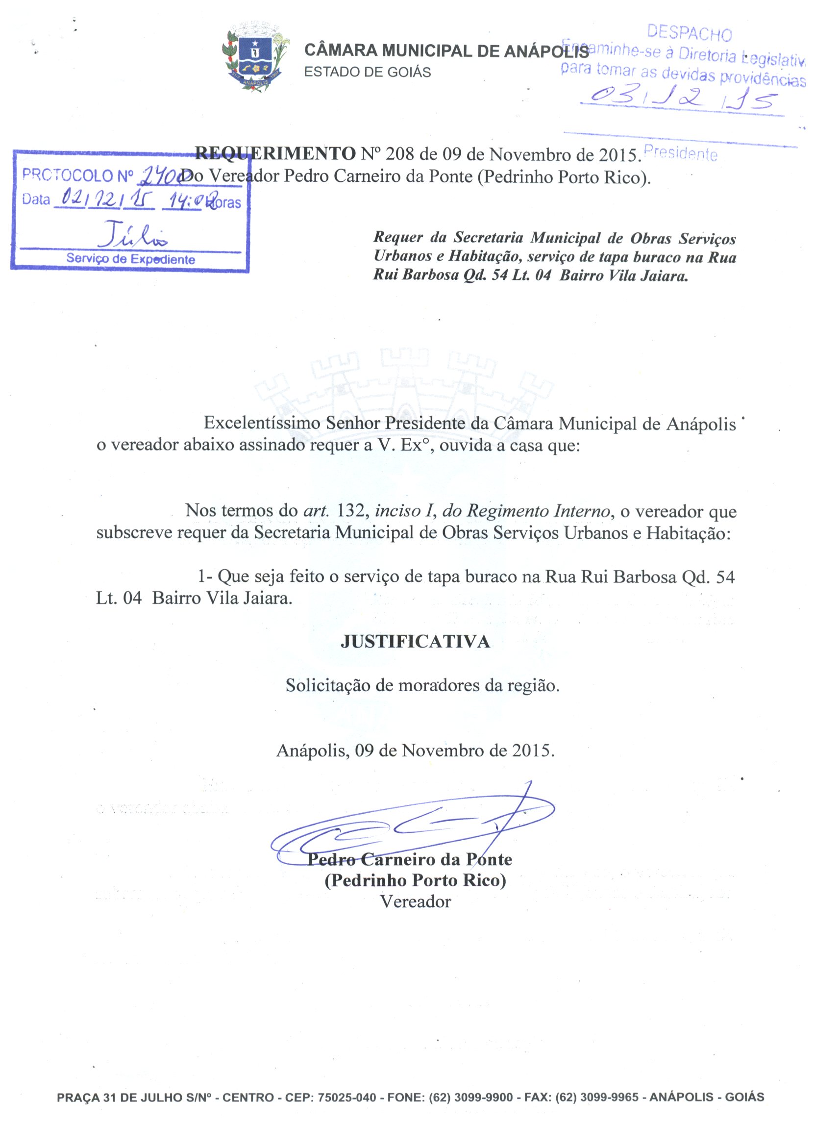 Ementa: À SECRETARIA DE OBRAS, SERVIÇOS URBANOS E HABITAÇÃO, SOLICITANDO O SERVIÇO DE TAPA-BURACO NA RUA RU BARBOSA QD. 54 LT. 04, NA VILA JAIARA.
