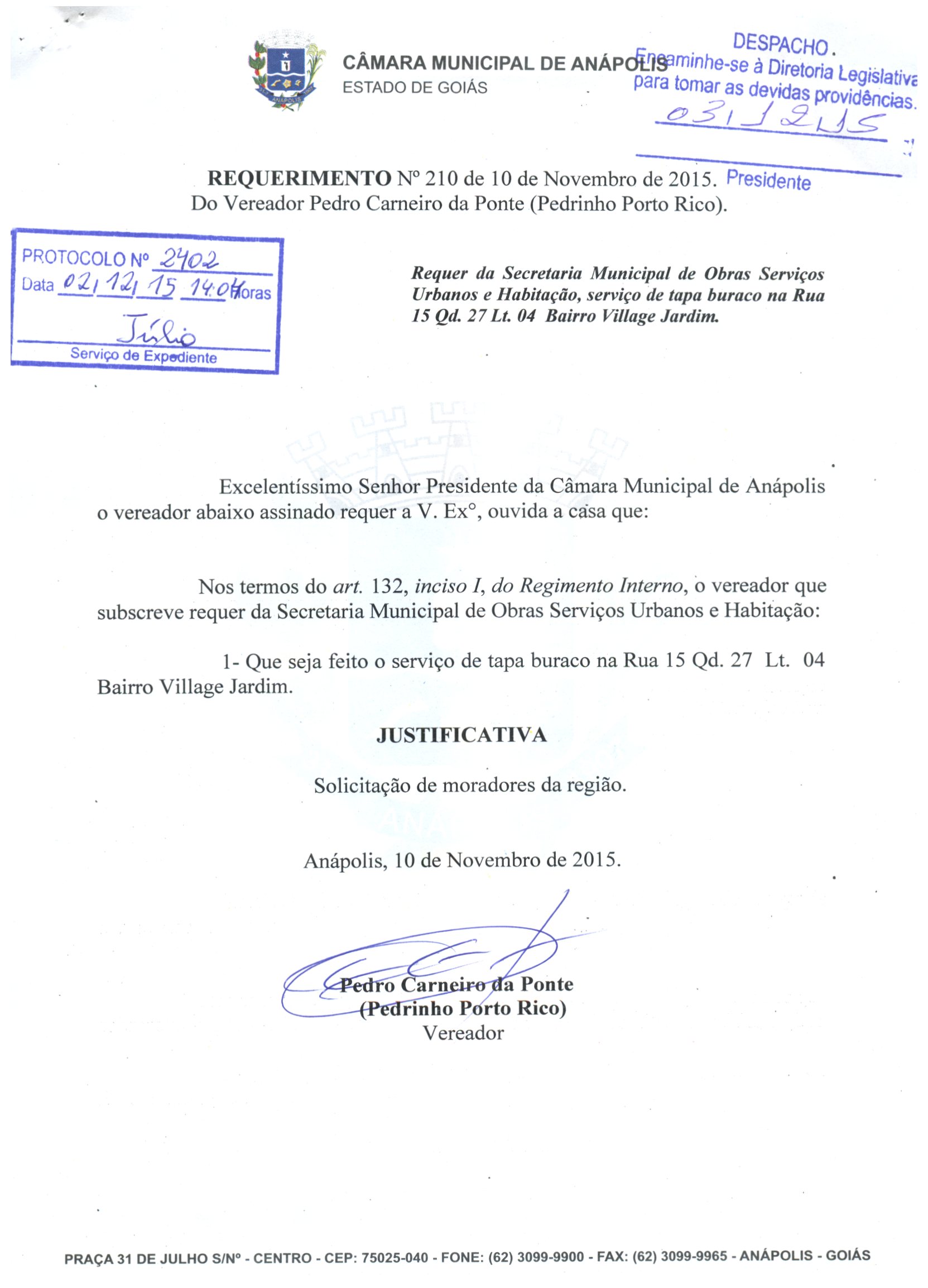 Ementa: À SECRETARIA DE OBRAS, SERVIÇOS URBANOS E HABITAÇÃO, SOLICITANDO O SERVIÇO DE TAPA-BURACO NA RUA 15 QD. 27 LT. 04, NO VILLAGE JARDIM.