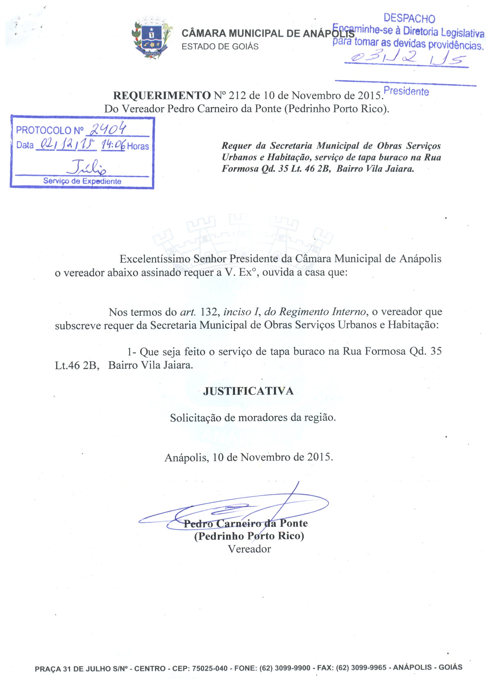 Ementa: À SECRETARIA DE OBRAS, SERVIÇOS URBANOS E HABITAÇÃO, SOLICITANDO O SERVIÇO DE TAPA-BURACO NA RUA FORMOSA QD. 35 LT. 46 2B, NA VILA JAIARA.