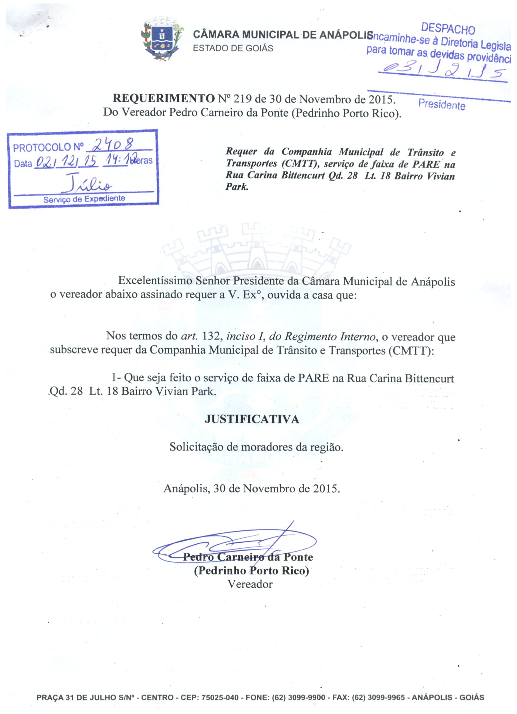 Ementa: À CMTT, SOLICITANDO O SERVIÇO DE FAIXA PARE NA RUA CARINA BITTENCURT QD. 28 LT. 18, NO VIVIAN PARQUE.