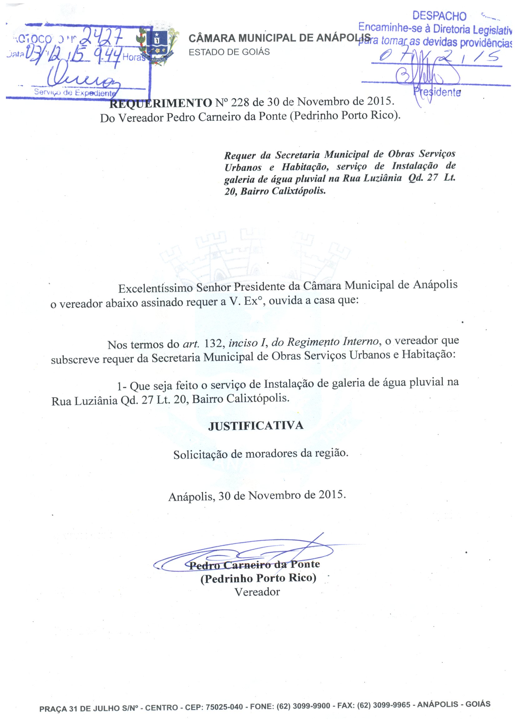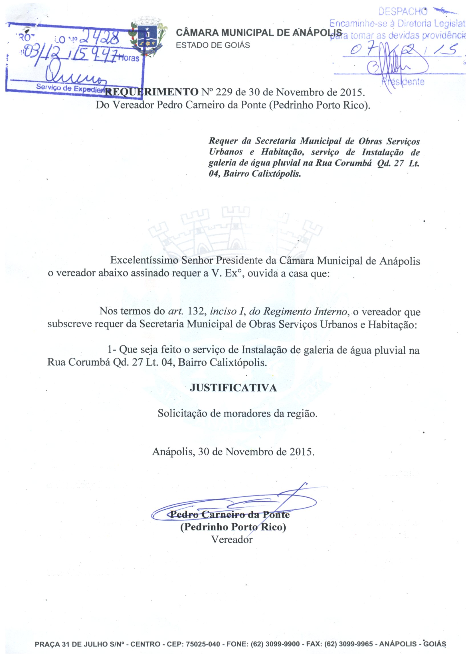 Ementa: À SECRETARIA MUNICIPAL DE OBRAS SERVIÇOS URBANOS E HABITAÇÃO, SOLICITANDO O SERVIÇO DE INSTALAÇÃO DE GALERIA DE ÁGUA PLUVIAL NA RUA LUZIÂNIA QD. 27 LT. 20 BAIRRO CALIXTÓPOLIS.