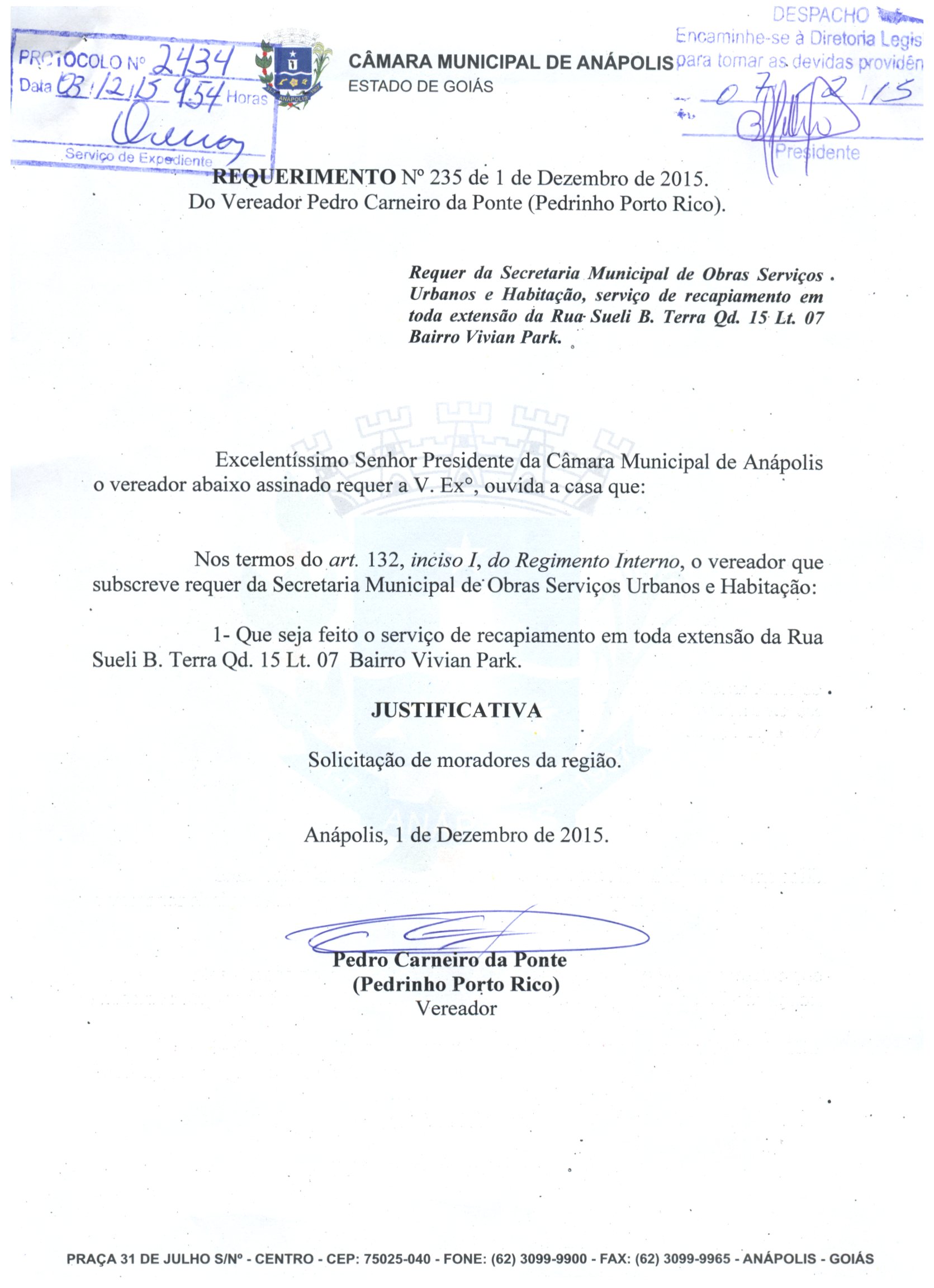 Ementa: À SECRETARIA MUNICIPAL DE OBRAS SERVIÇOS URBANOS E HABITAÇÃO, SOLICITANDO O SERVIÇO DE RECAPEAMENTO EM TODA EXTENSÃO DA RUA SUELI B. TERRA QD. 15 LT. 07, NO BAIRRO VIVIAN PARQUE.