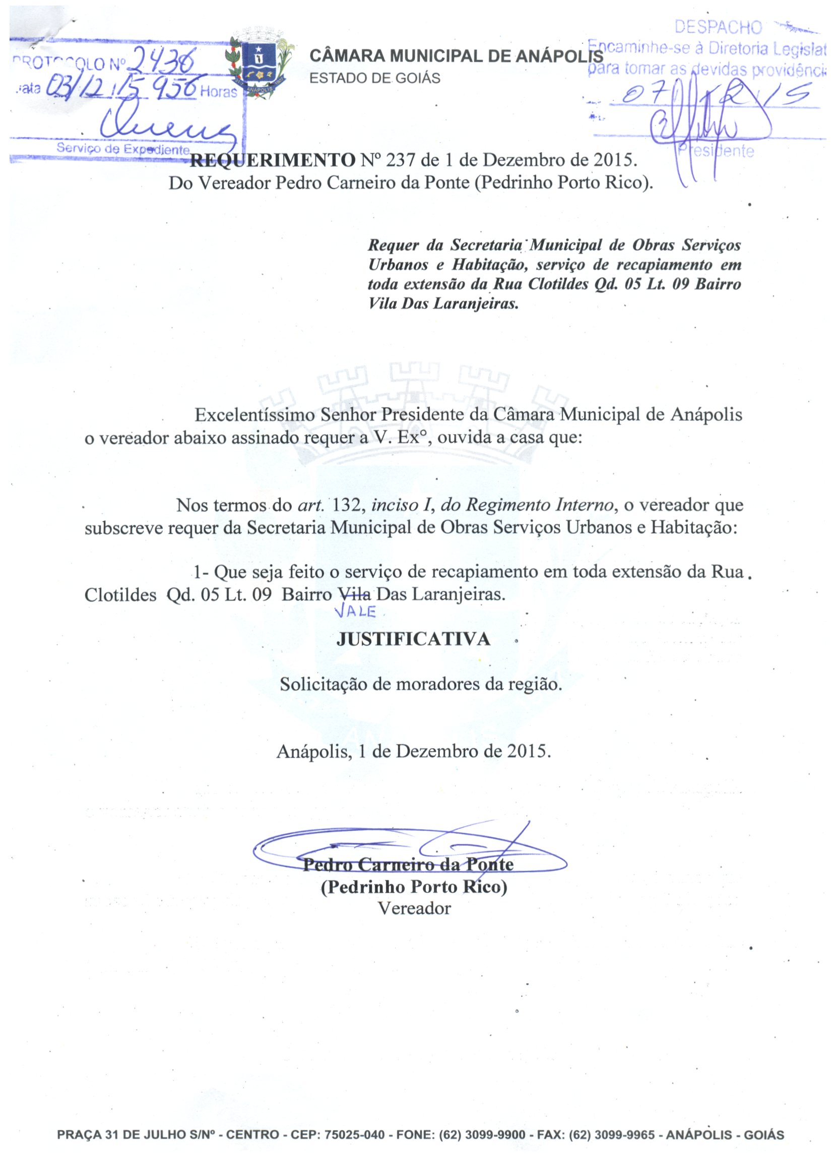 Ementa: À SECRETARIA MUNICIPAL DE OBRAS SERVIÇOS URBANOS E HABITAÇÃO, SOLICITANDO O SERVIÇO DE RECAPEAMENTO EM TODA EXTENSÃO DA RUA CLOTILDES QD. 05 LT. 09 BAIRRO VILA DAS LARANJEIRAS.
