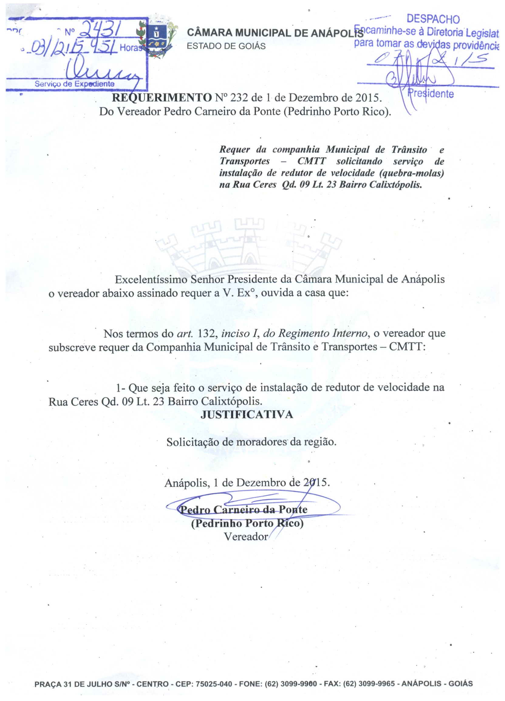 Ementa: À CMTT SOLICITANDO O SERVIÇO DE INSTALADOR DE REDUTOR DE VELOCIDADE, QUEBRA-MOLA, NA RUA CERES QD. 09 LT. 23, NO BAIRRO CALIXTÓPOLIS.