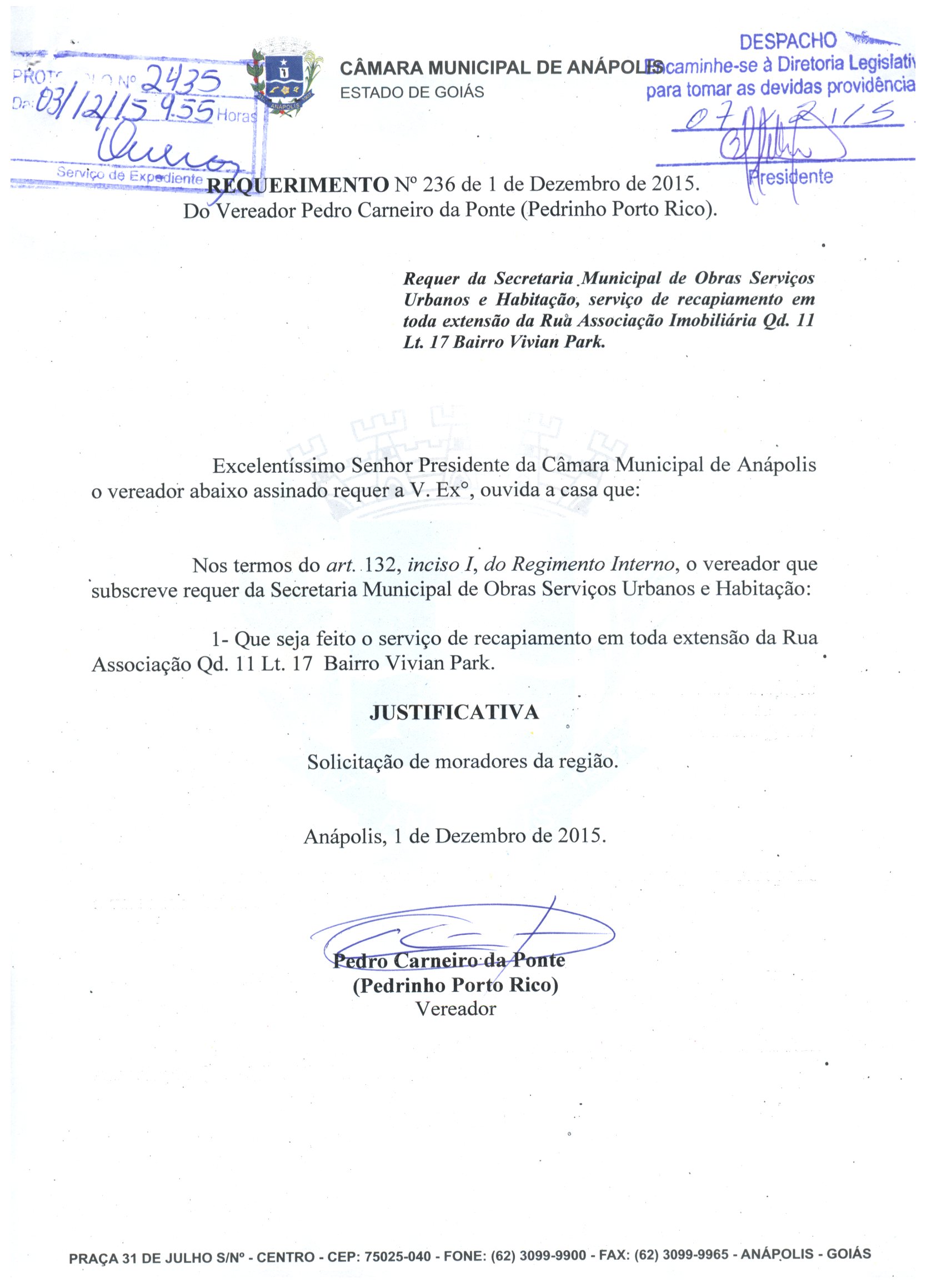 Ementa: À SECRETARIA MUNICIPAL DE OBRAS SERVIÇOS URBANOS E HABITAÇÃO, SOLICITANDO O SERVIÇO DE RECAPEAMENTO ASFÁLTICO EM TODA A EXTENSÃO DA RUA ASSOCIAÇÃO IMOBILIÁRIA QD. 11 LT. 17, NO VIVIAN PARQUE.
