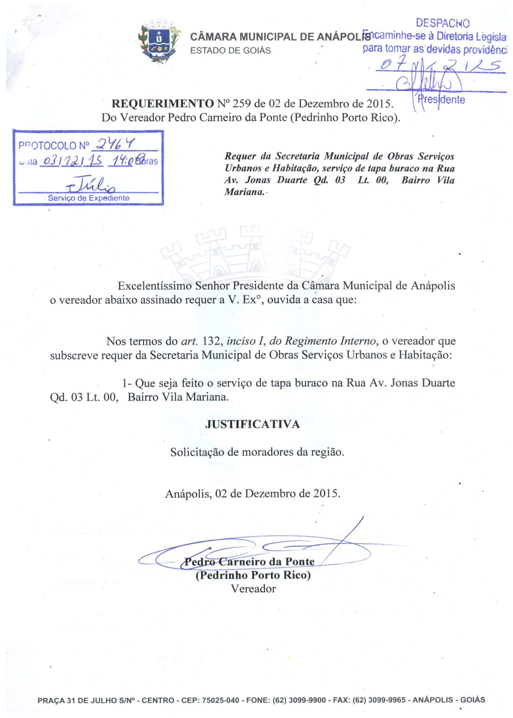 ![]() À SECRETARIA MUNICIPAL DE OBRAS, SERVIÇOS URBANOS E HABITAÇÃO, SOLICITANDO O SERVIÇO DE TAPA-BURACO NA RUA AV. JONAS DUARTE QD. 03 LT. 00, VILA MARIANA.