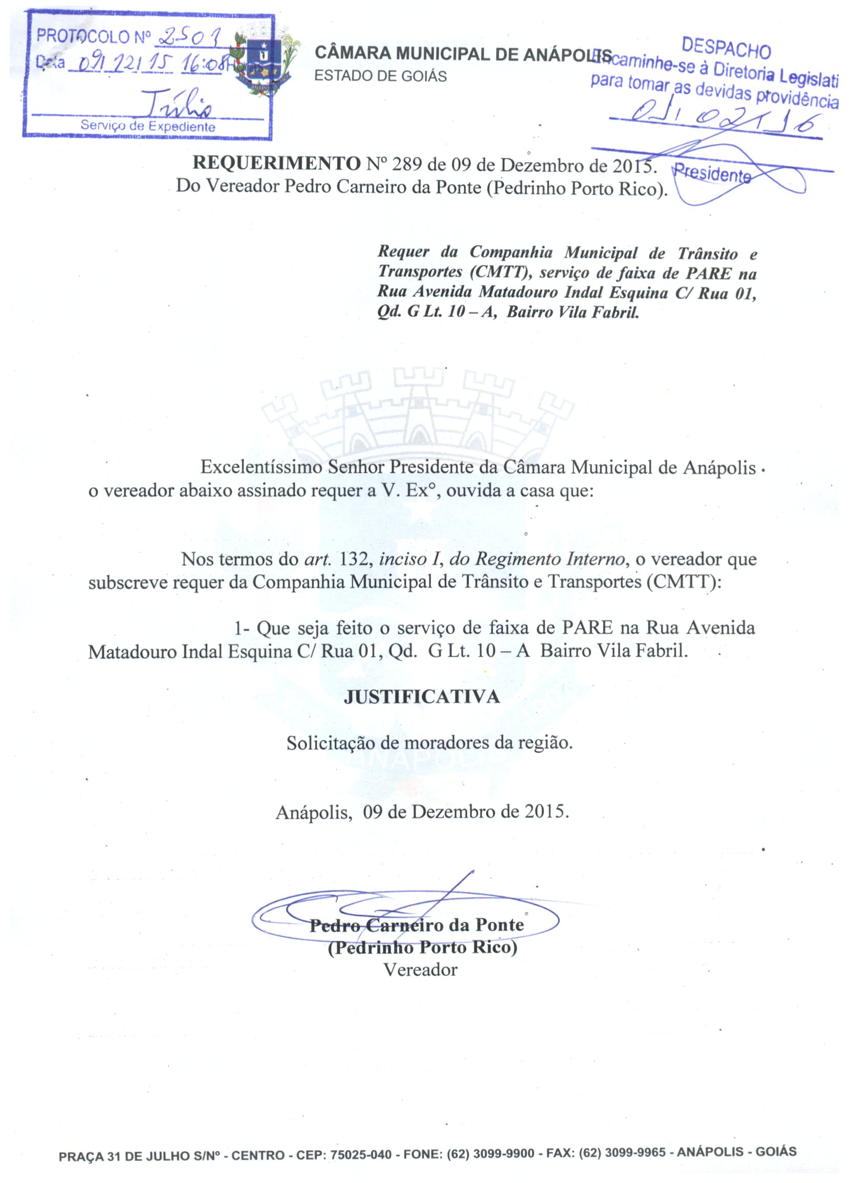 ![]() À CMTT SOLICITANDO FAIXA PARE NA AV. MATADOURO INDAL ESQUINA COM RUA 01, QD. G LT. 10 - A.