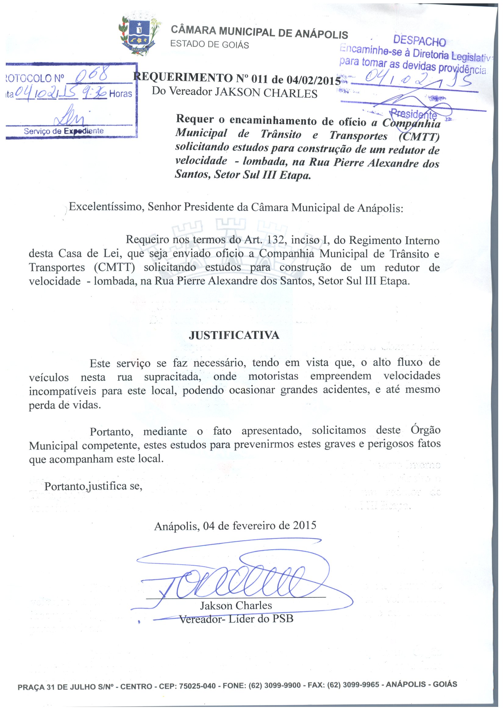 Ementa: REQUEIRO NOS TERMOS DO ART. 132, INCISO I, DO REGIMENTO INTERNO DESTA CASA DE LEI, QUE SEJA ENVIADO OFÍCIO À COMPANHIA MUNICIPAL DE TRÂNSITO E TRANSPORTES (CMTT) SOLICITANDO ESTUDOS PARA CONSTRUÇÃO DE UM REDUTOR DE VELOCIDADE - LOMBADA, NA RUA PIERRE ALEXANDRE DOS SANTOS, SETOR SUL III ETAPA.