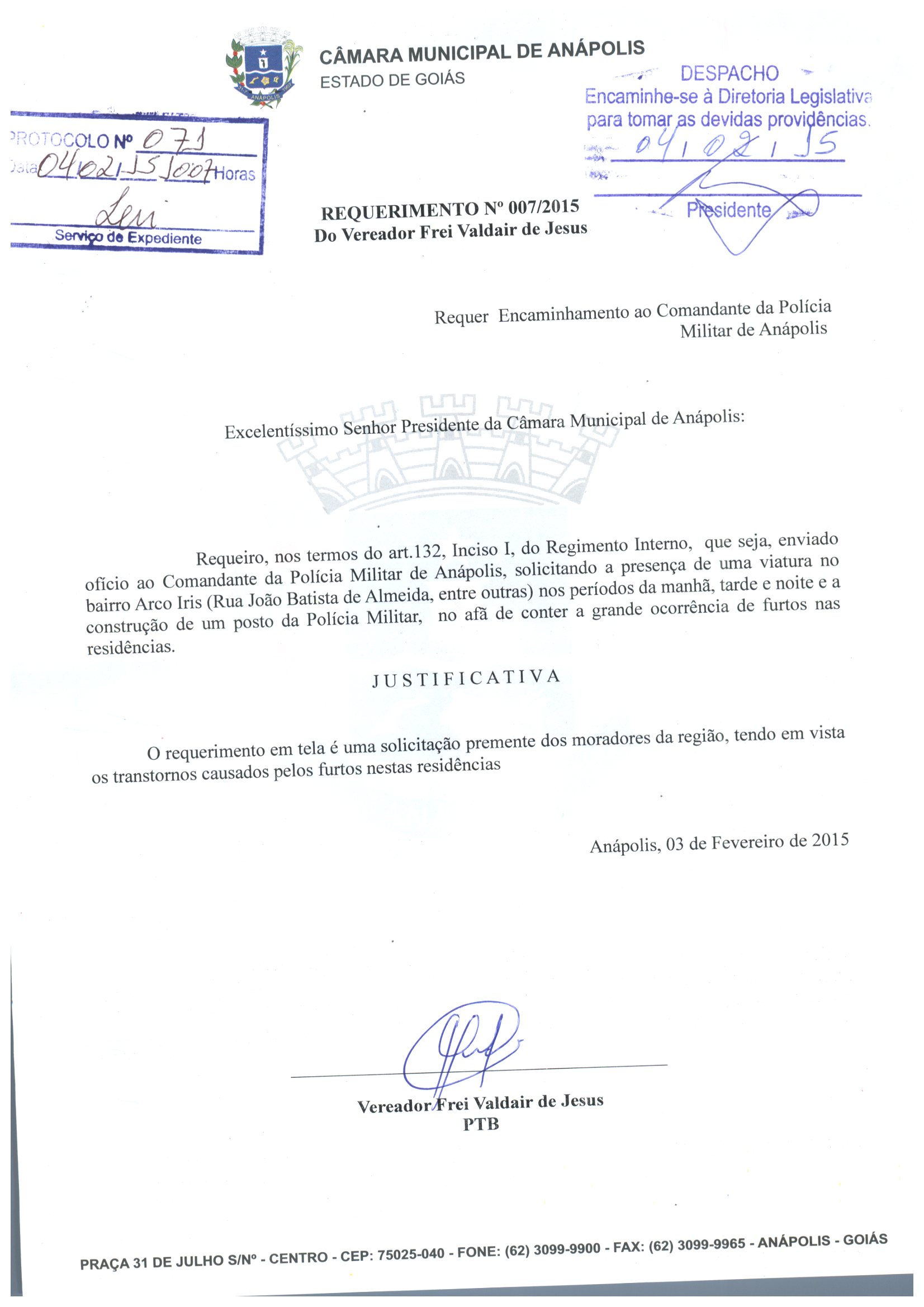 Ementa: REQUEIRO, NOS TERMOS DO ART.132, INCISO I, DO REGIMENTO INTERNO, QUE SEJA, ENVIADO OFÍCIO AO COMANDANTE DA POLICIA MILITAR DE ANÁPOLIS, SOLICITANDO A PRESENÇA DE UMA VIATURA NO BAIRRO ARCO IRIS (RUA JOÃO BATISTA DE ALMEIDA, ENTRE OUTRAS) NOS PERÍODOS DA MANHÃ, TARDE E NOITE E A CONSTRUÇÃO DE UM POSTO DA POLICIA MILITAR, NO AFÃ DE CONTER A GRANDE OCORRÊNCIA DE FURTOS NAS RESIDÊNCIAS.