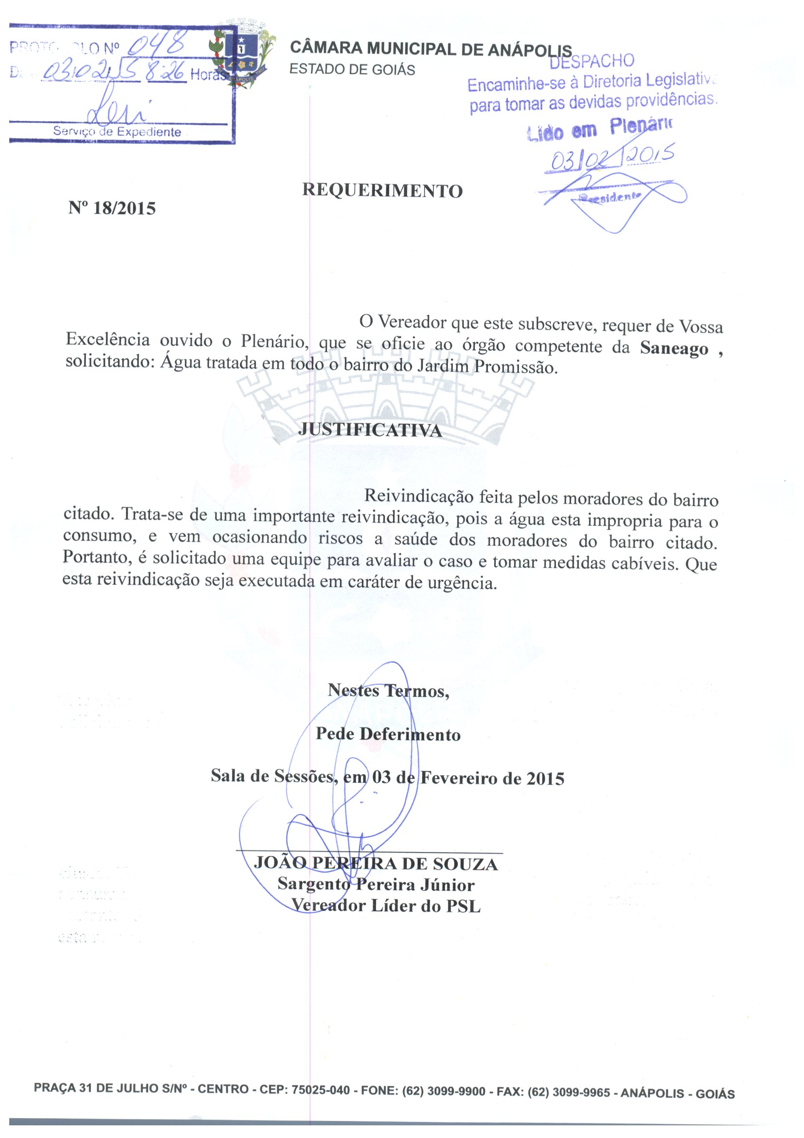 Ementa: 0 VEREADOR QUE ESTE SUBSCREVE, REQUER DE VOSSA EXCELÊNCIA OUVIDO O PLENÁRIO, QUE SE OFICIE AO ÓRGÃO COMPETENTE DA SANEAGO , SOLICITANDO: ÁGUA TRATADA EM TODO O BAIRRO DO JARDIM PROMISSÃO.