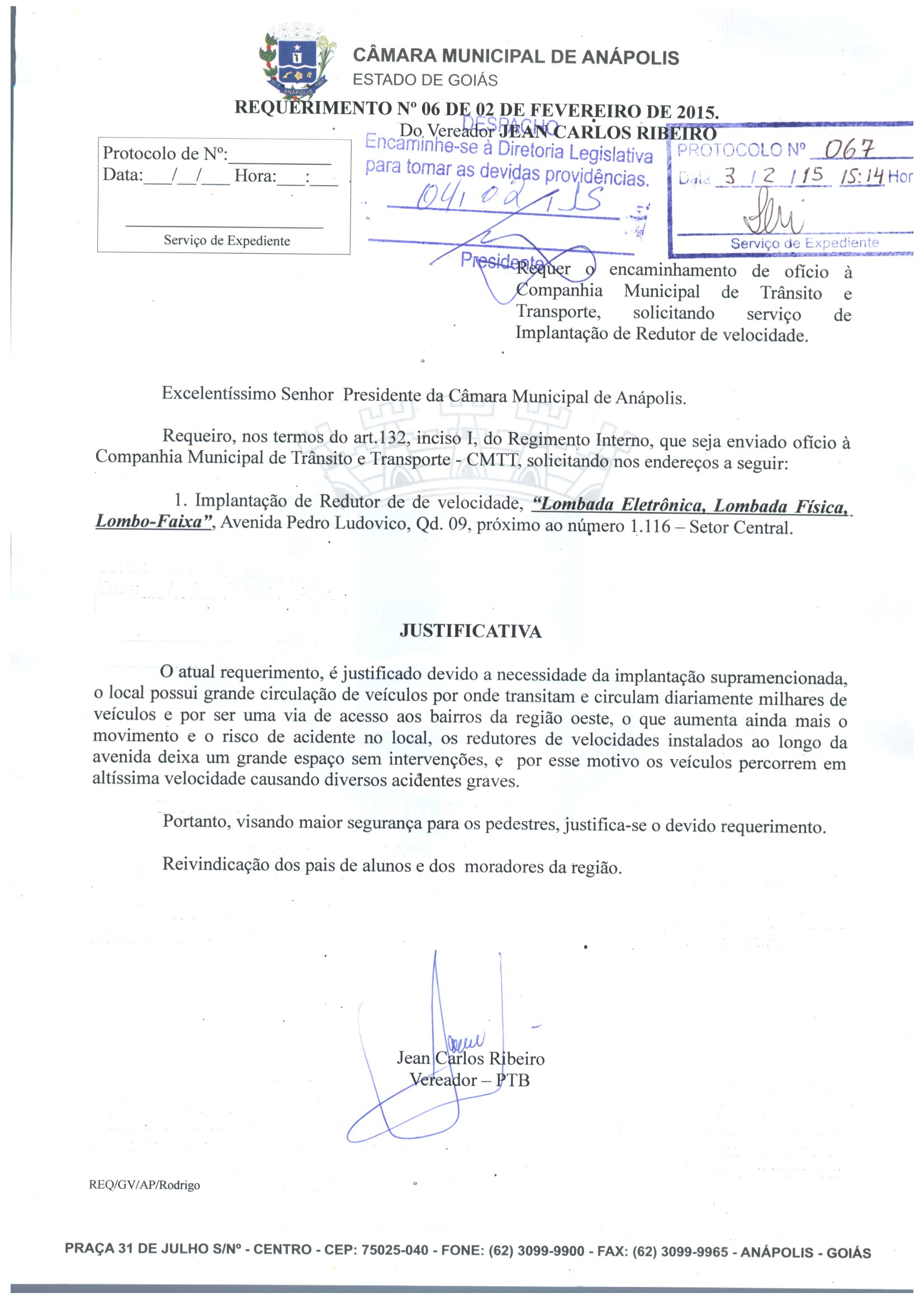 Ementa: REQUEIRO, NOS TERMOS DO ART.132, INCISO I, DO REGIMENTO INTERNO, QUE SEJA ENVIADO OFÍCIO À COMPANHIA MUNICIPAL DE TRÂNSITO E TRANSPORTE - CMTT, SOLICITANDO NOS ENDEREÇOS A SEGUIR: 1. IMPLANTAÇÃO DE REDUTOR DE VELOCIDADE, "LOMBADA ELETRÔNICA, LOMBADA FÍSICA, LOMBO-FAIXA", AVENIDA PEDRO LUDOVICO, QD. 09, PRÓXIMO AO NÚMERO 1.116 — SETOR CENTRAL.