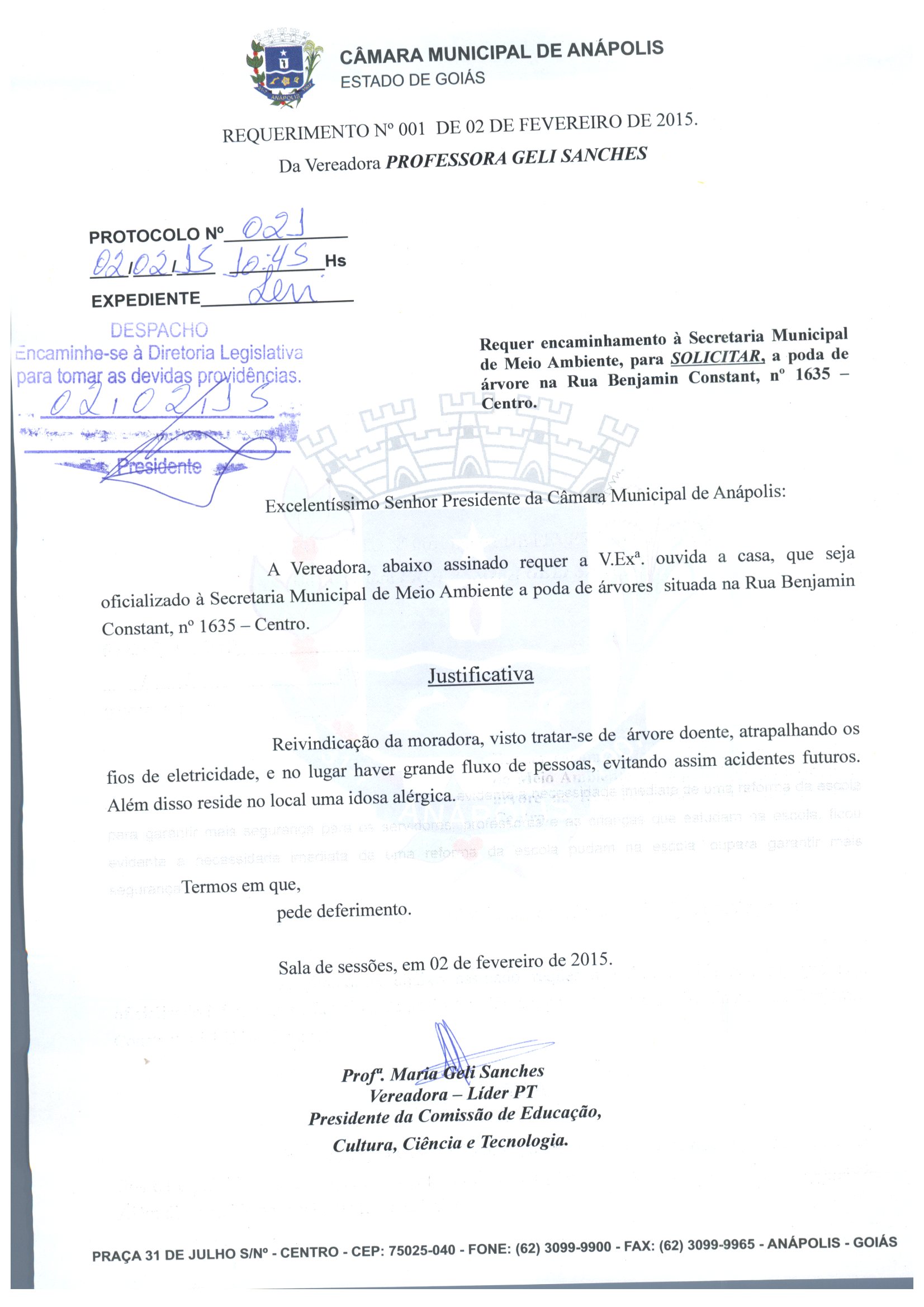 Ementa: A VEREADORA, ABAIXO ASSINADO REQUER A V.EXA. OUVIDA A CASA, QUE SEJA OFICIALIZADO À SECRETARIA MUNICIPAL DE MEIO AMBIENTE A PODA DE ÁRVORES SITUADA NA RUA BENJAMIN CONSTANT, N° 1635 — CENTRO.