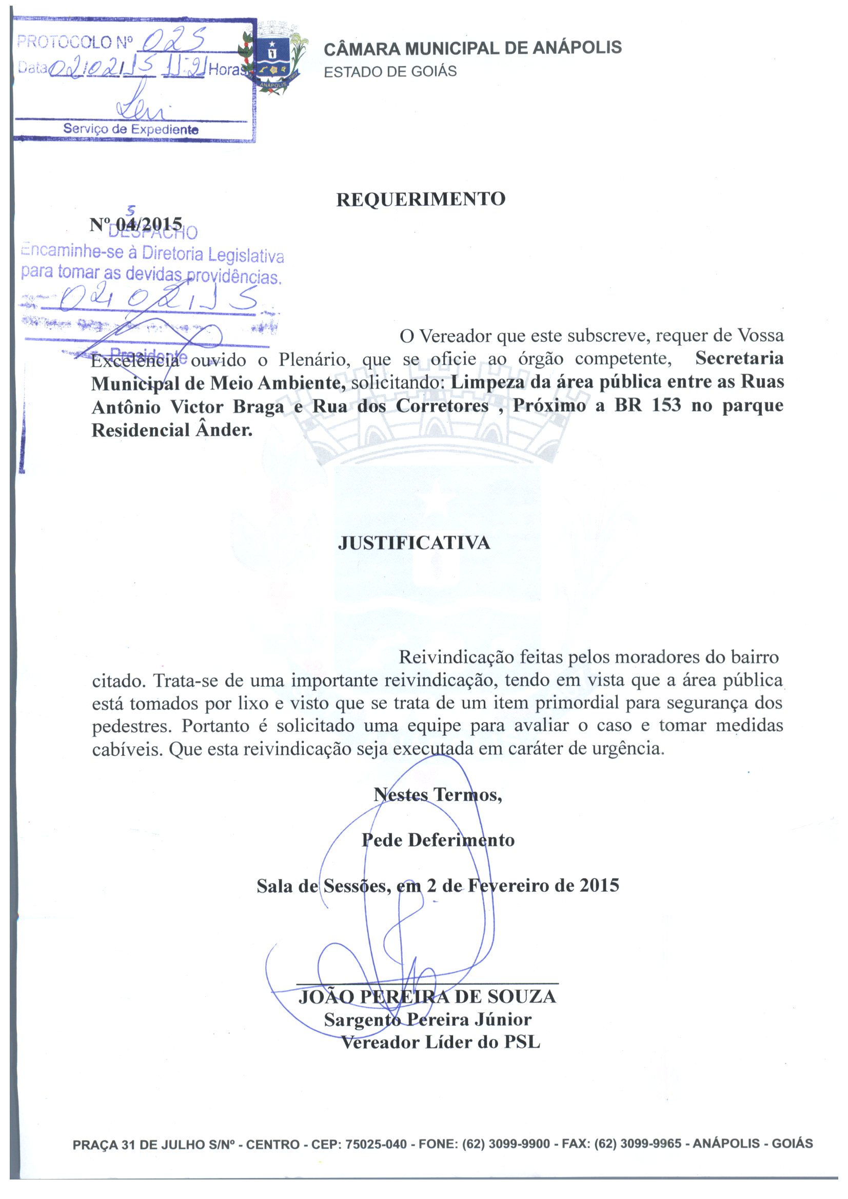 Ementa: O VEREADOR QUE ESTE SUBSCREVE, REQUER DE VOSSA EXCELÊNCIA OUVIDO O PLENÁRIO, QUE SE OFICIE AO ÓRGÃO COMPETENTE, SECRETARIA MUNICIPAL DE MEIO AMBIENTE, SOLICITANDO: LIMPEZA DA ÁREA PÚBLICA ENTRE AS RUAS ANTÔNIO VICTOR BRAGA E RUA DOS CORRETORES , PRÓXIMO A BR 153 NO PARQUE RESIDENCIAL ANDER.