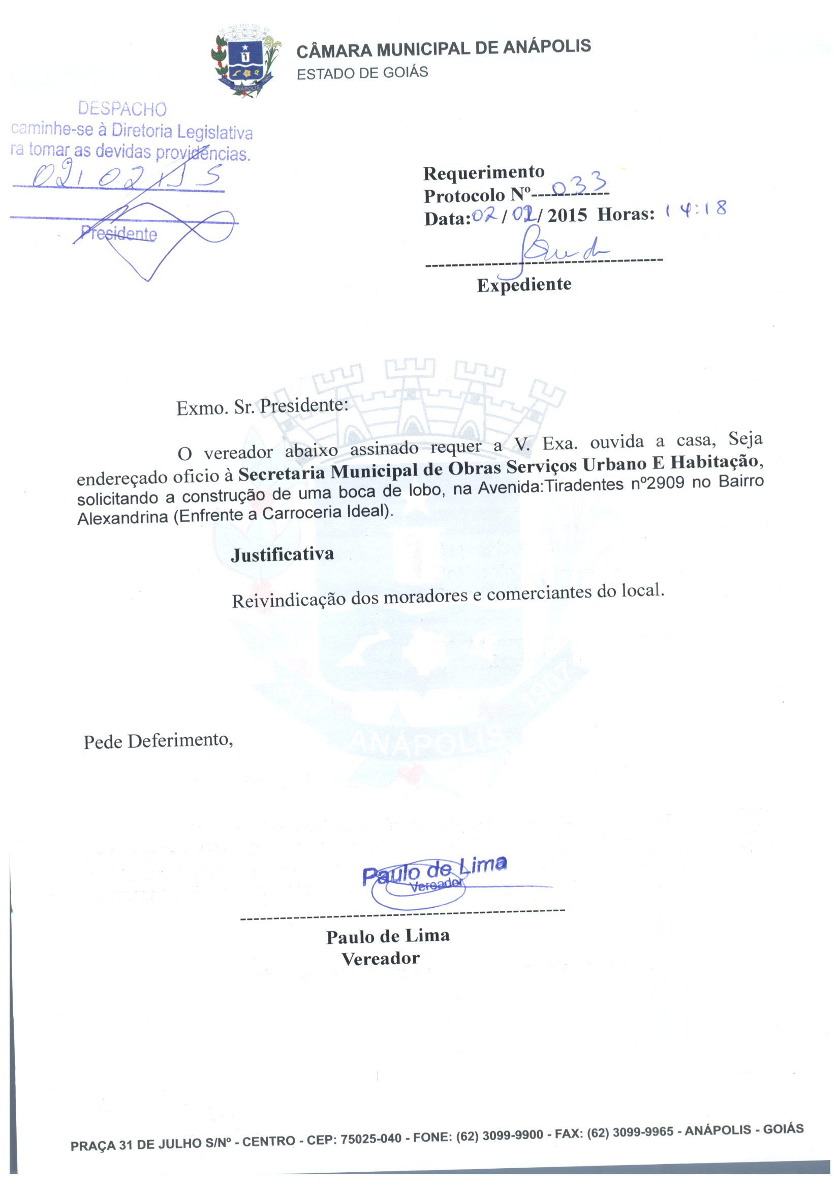 Ementa: O VEREADOR ABAIXO ASSINADO REQUER A V. EXA. OUVIDA A CASA, SEJA ENDEREÇADO OFICIO À SECRETARIA MUNICIPAL DE OBRAS SERVIÇOS URBANO E HABITAÇÃO, SOLICITANDO A CONSTRUÇÃO DE UMA BOCA DE LOBO, NA AVENIDA: TIRADENTES, N°2909, NO BAIRRO ALEXANDRINA (EM FRENTE A CARROCERIA IDEAL).