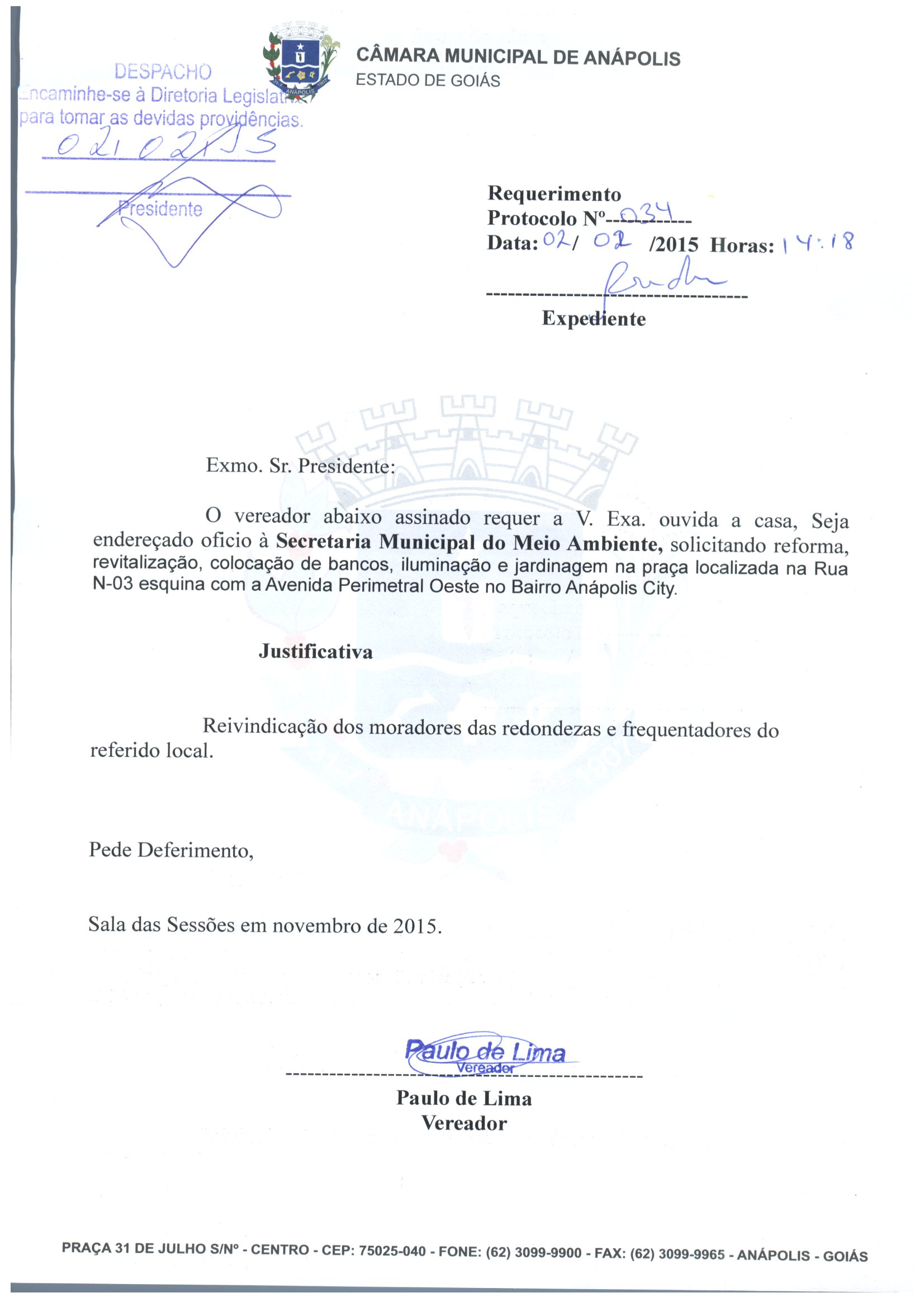 Ementa: O VEREADOR ABAIXO ASSINADO REQUER A V. EXA. OUVIDA A CASA, SEJA ENDEREÇADO OFICIO À SECRETARIA MUNICIPAL DO MEIO AMBIENTE, SOLICITANDO REFORMA, REVITALIZAÇÃO, COLOCAÇÃO DE BANCOS, ILUMINAÇÃO E JARDINAGEM NA PRAÇA LOCALIZADA NA RUA N-03 ESQUINA COM A AVENIDA PERIMETRAL OESTE NO BAIRRO ANÁPOLIS CITY.
