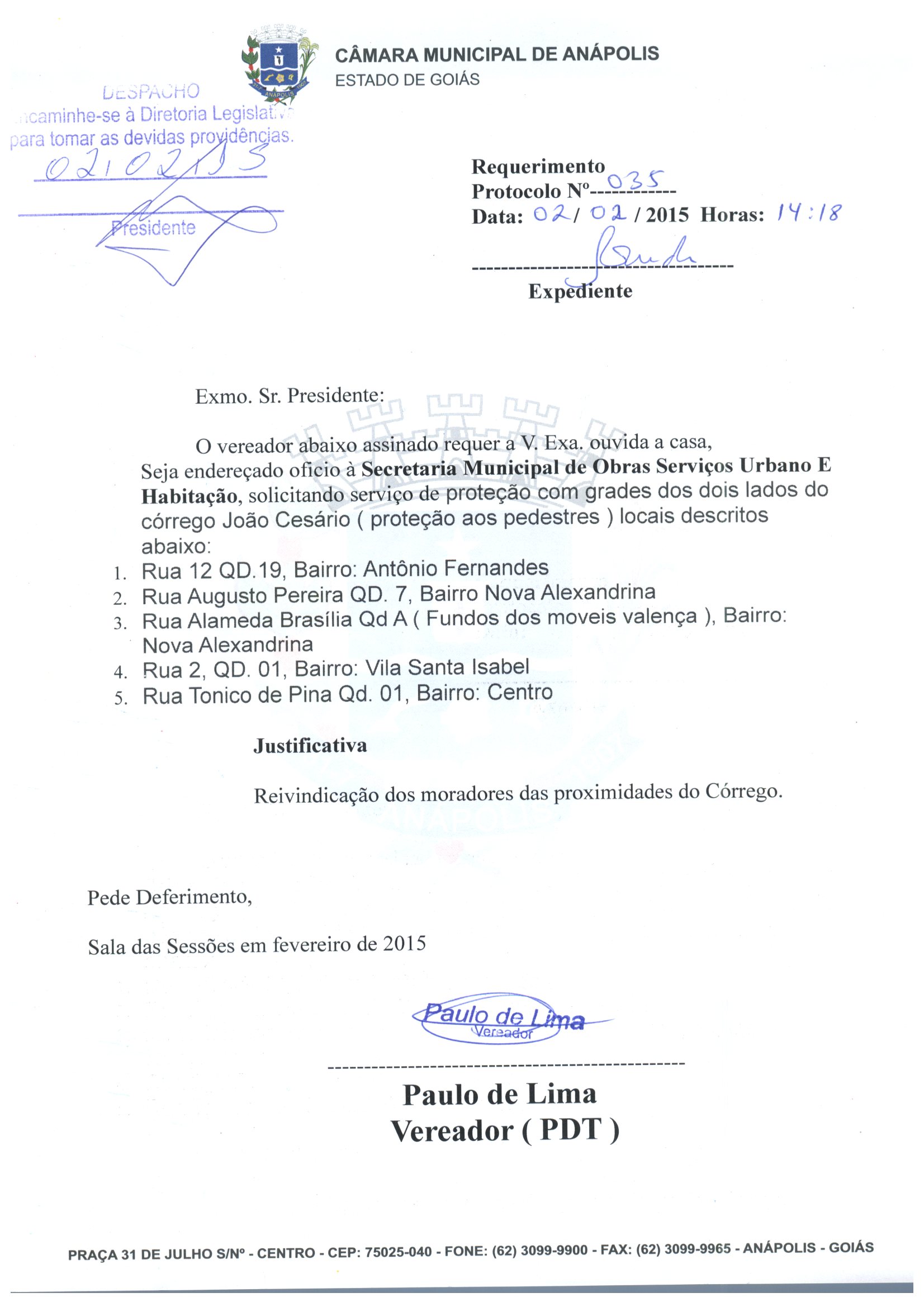 Ementa: O VEREADOR ABAIXO ASSINADO REQUER A V. EXA. OUVIDA A CASA, SEJA ENDEREÇADO OFICIO À SECRETARIA MUNICIPAL DE OBRAS SERVIÇOS URBANO E HABITAÇÃO, SOLICITANDO SERVIÇO DE PROTEÇÃO COM GRADES DOS DOIS LADOS DO CÓRREGO JOÃO CESÁRIO ( PROTEÇÃO AOS PEDESTRES ) LOCAIS DESCRITOS ABAIXO: 1. RUA 12 QD.19, BAIRRO: ANTÔNIO FERNANDES 2. RUA AUGUSTO PEREIRA QD. 7, BAIRRO NOVA ALEXANDRINA 3. RUA ALAMEDA BRASÍLIA QD A ( FUNDOS DOS MOVEIS VALENÇA ), BAIRRO: NOVA ALEXANDRINA 4. RUA 2, QD. 01, BAIRRO: VILA SANTA ISABEL 5. RUA TONICO DE PINA QD. 01, BAIRRO: CENTRO