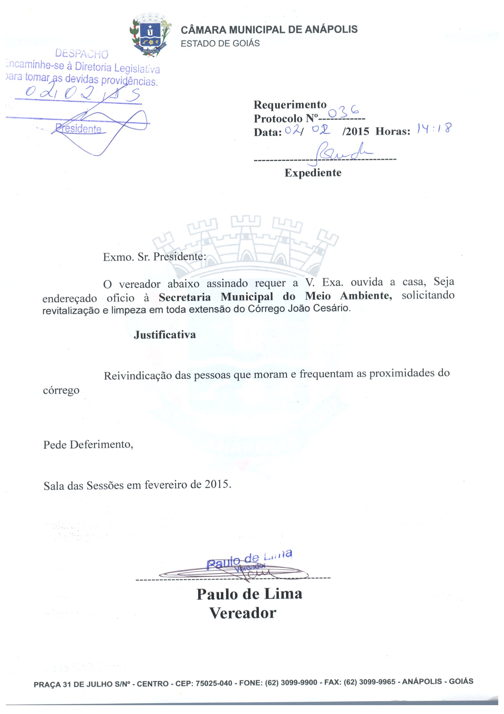 Ementa: O VEREADOR ABAIXO ASSINADO REQUER A V. EXA. OUVIDA A CASA, SEJA ENDEREÇADO OFICIO À SECRETARIA MUNICIPAL DO MEIO AMBIENTE, SOLICITANDO REVITALIZAÇÃO E LIMPEZA EM TODA EXTENSÃO DO CÓRREGO JOÃO CESÁRIO.