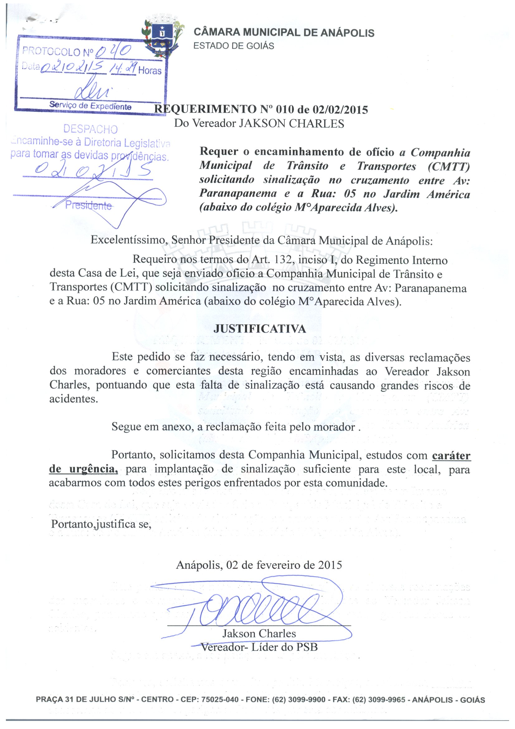 Ementa: REQUEIRO NOS TERMOS DO ART. 132, INCISO I, DO REGIMENTO INTERNO DESTA CASA DE LEI, QUE SEJA ENVIADO OFICIO A COMPANHIA MUNICIPAL DE TRÂNSITO E TRANSPORTES (CMTT) SOLICITANDO SINALIZAÇÃO NO CRUZAMENTO ENTRE AV: PARANAPANEMA E A RUA: 05 NO JARDIM AMÉRICA (ABAIXO DO COLÉGIO M°APARECIDA ALVES).