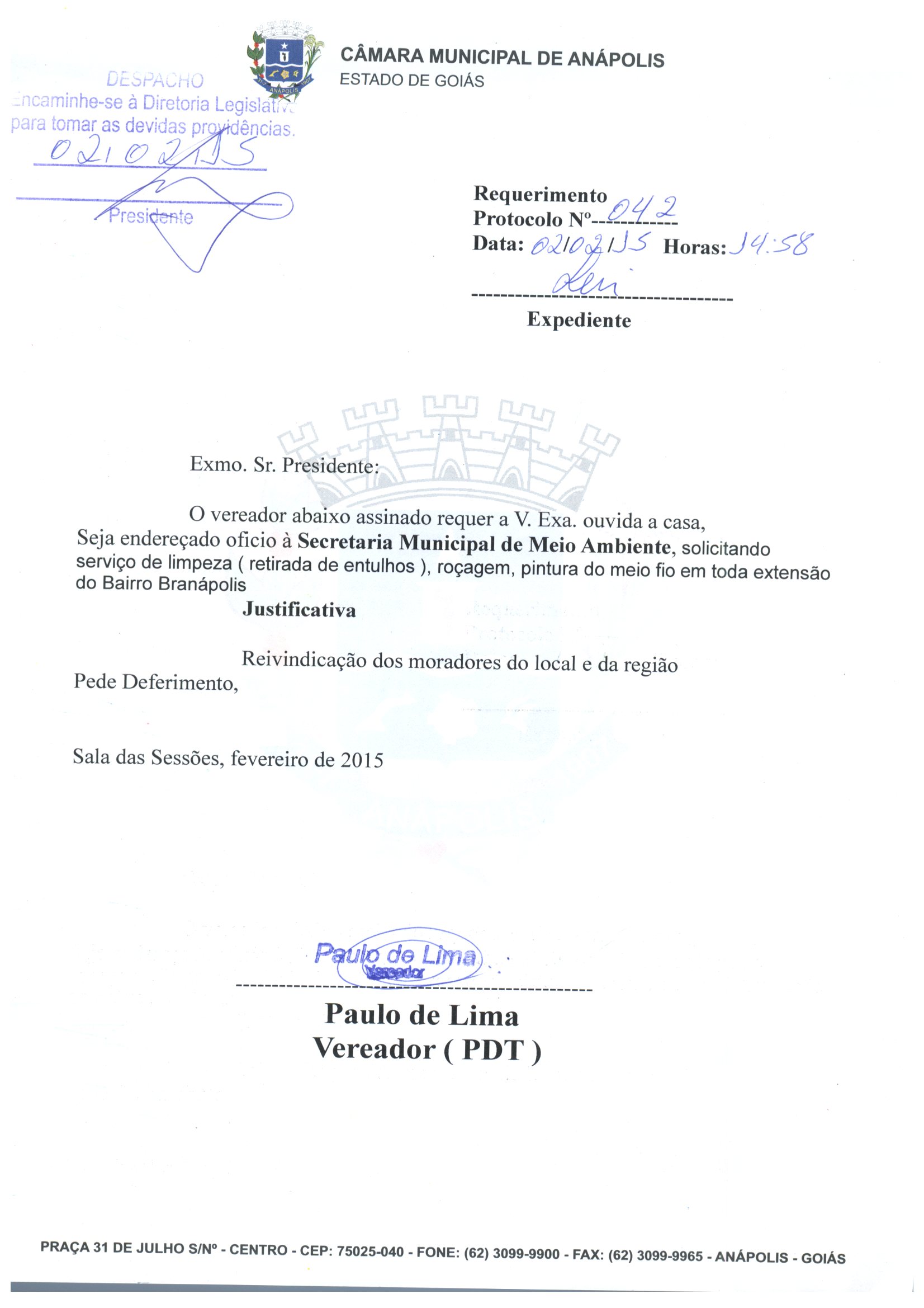 Ementa: O VEREADOR ABAIXO ASSINADO REQUER A V. EXA. OUVIDA A CASA, SEJA ENDEREÇADO OFICIO À SECRETARIA MUNICIPAL DE MEIO AMBIENTE, SOLICITANDO SERVIÇO DE LIMPEZA ( RETIRADA DE ENTULHOS ), ROÇAGEM, PINTURA DO MEIO FIO EM TODA EXTENSÃO DO BAIRRO BRANÁPOLIS
