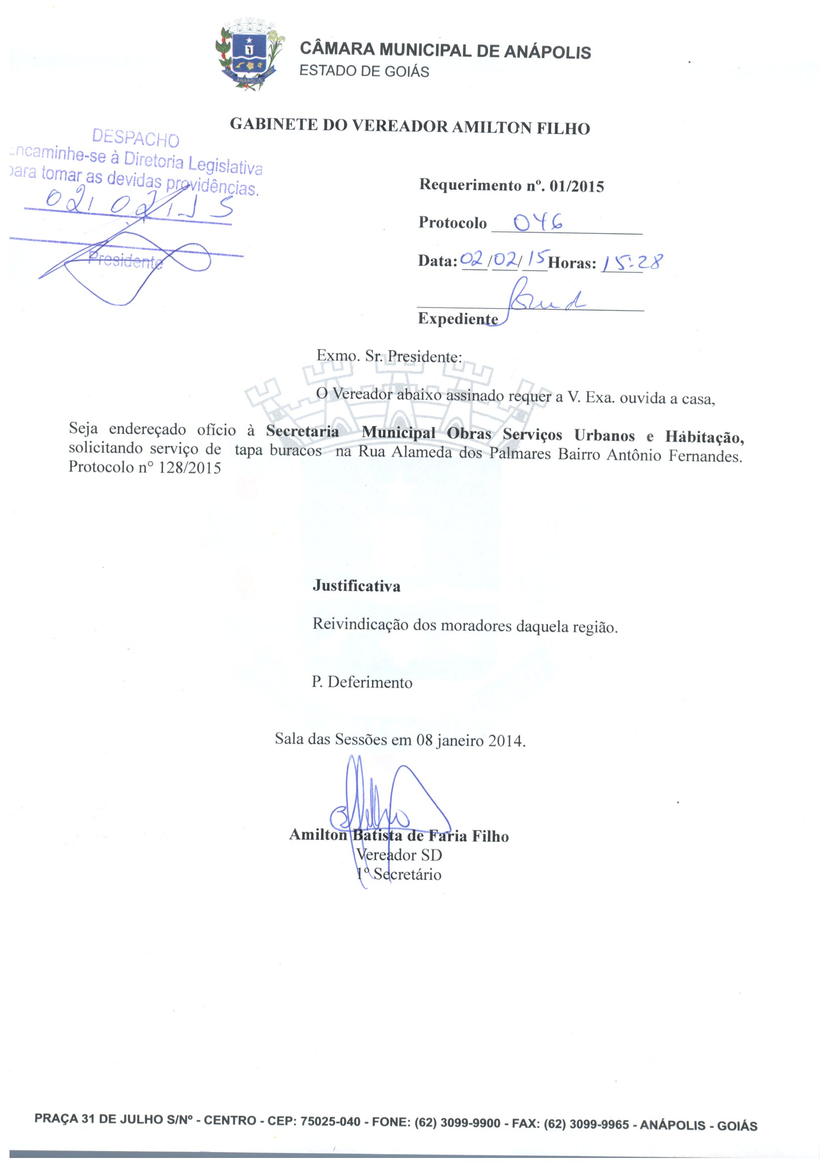 Ementa: SEJA ENDEREÇADO OFÍCIO À SECRETARIA MUNICIPAL DE OBRAS, SERVIÇOS URBANOS E HABITAÇÃO, SOLICITANDO SERVIÇO DE TAPA BURACOS NA RUA ALAMEDA DOS PALMARES BAIRRO ANTÔNIO FERNANDES. PROTOCOLO Nº 128/2015.