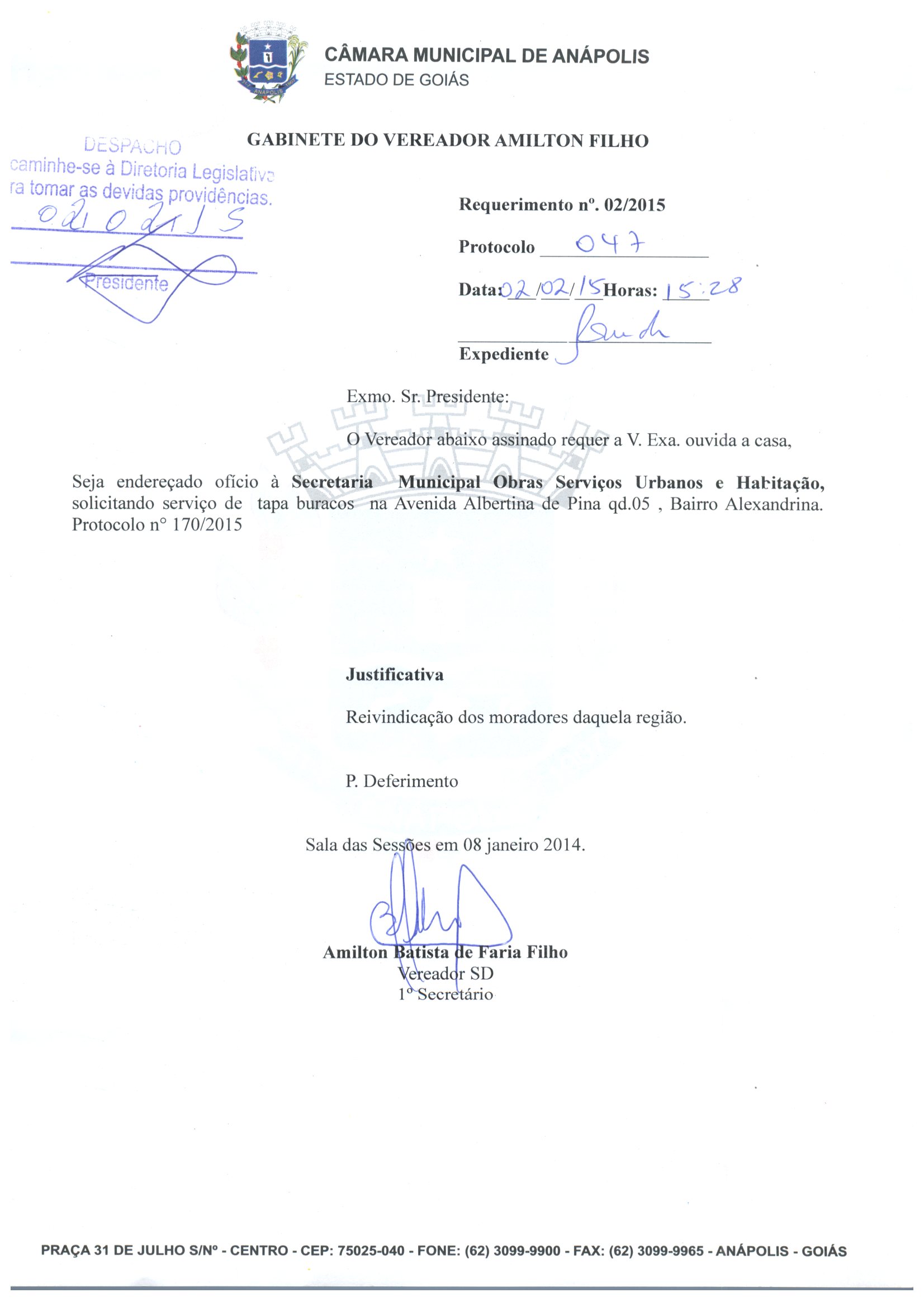 Ementa: SEJA ENDEREÇADO OFÍCIO À SECRETARIA MUNICIPAL DE OBRAS, SERVIÇOS URBANOS E HABITAÇÃO, SOLICITANDO SERVIÇO DE TAPA BURACOS NA AVENIDA ALBERTINA DE PINA, QUADRA 05, BAIRRO ALEXANDRINA. PROTOCOLO Nº 170/2015.