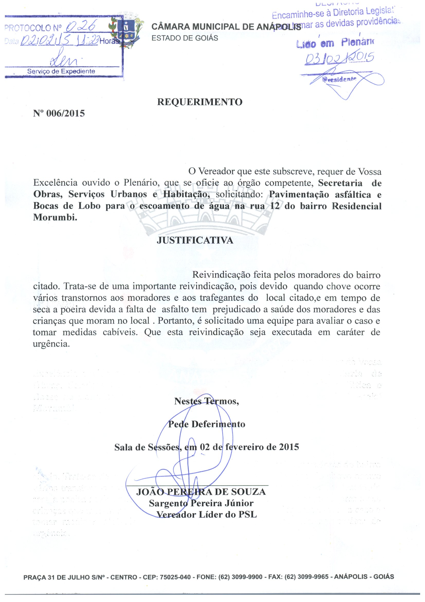 Ementa: 0 VEREADOR QUE ESTE SUBSCREVE, REQUER DE VOSSA EXCELÊNCIA OUVIDO O PLENÁRIO, QUE SE OFICIE AO ÓRGÃO COMPETENTE, SECRETARIA DE OBRAS, SERVIÇOS URBANOS E HABITAÇÃO, SOLICITANDO: PAVIMENTAÇÃO ASFÁLTICA E BOCAS DE LOBO PARA O ESCOAMENTO DE AGUA NA RUA 12 DO BAIRRO RESIDENCIAL MORUMBI.