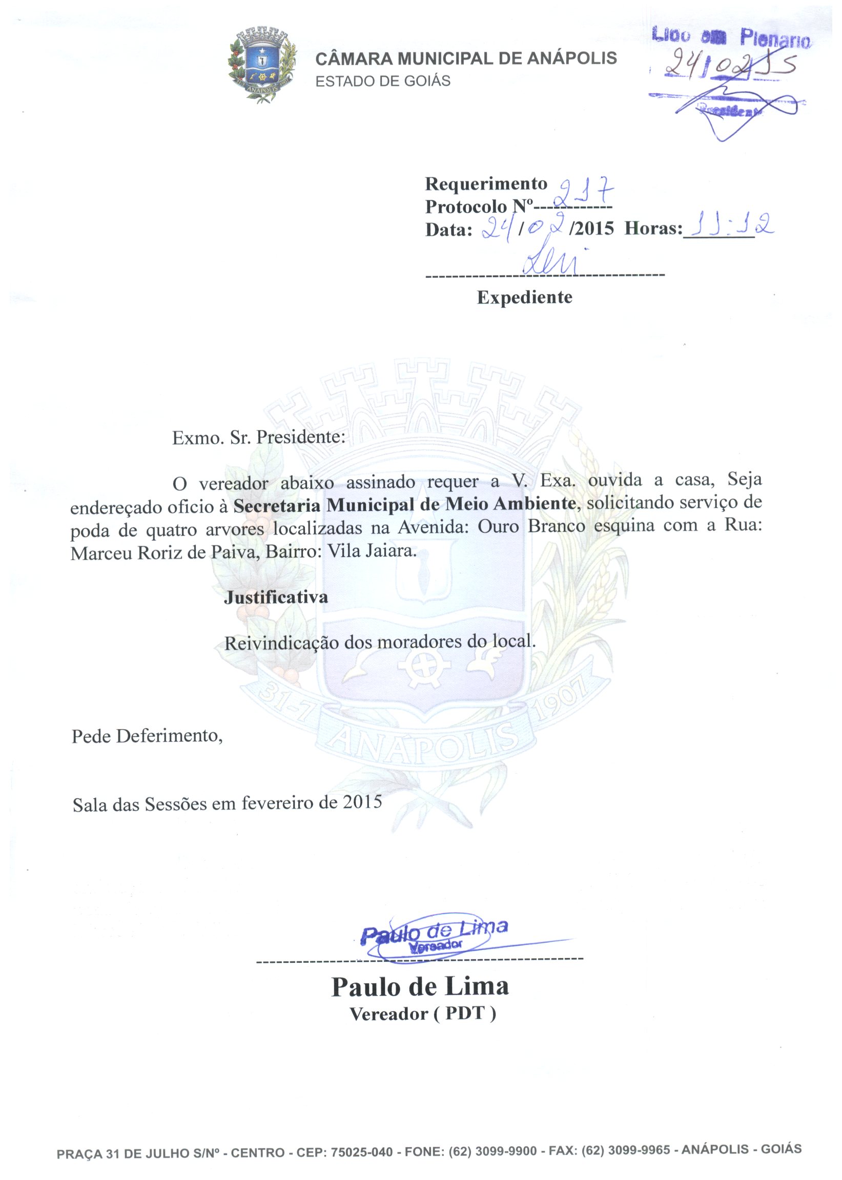 Ementa: O VEREADOR ABAIXO ASSINADO REQUER A V. EXA. OUVIDA A CASA, SEJA ENDEREÇADO OFÍCIO À SECRETARIA MUNICIPAL DE MEIO AMBIENTE, SOLICITANDO SERVIÇO DE PODA DE QUATRO ÁRVORES LOCALIZADAS NA AVENIDA: OURO BRANCO ESQUINA COM A RUA: MARCEU RORIZ DE PAIVA, BAIRRO: VILA JAIARA.