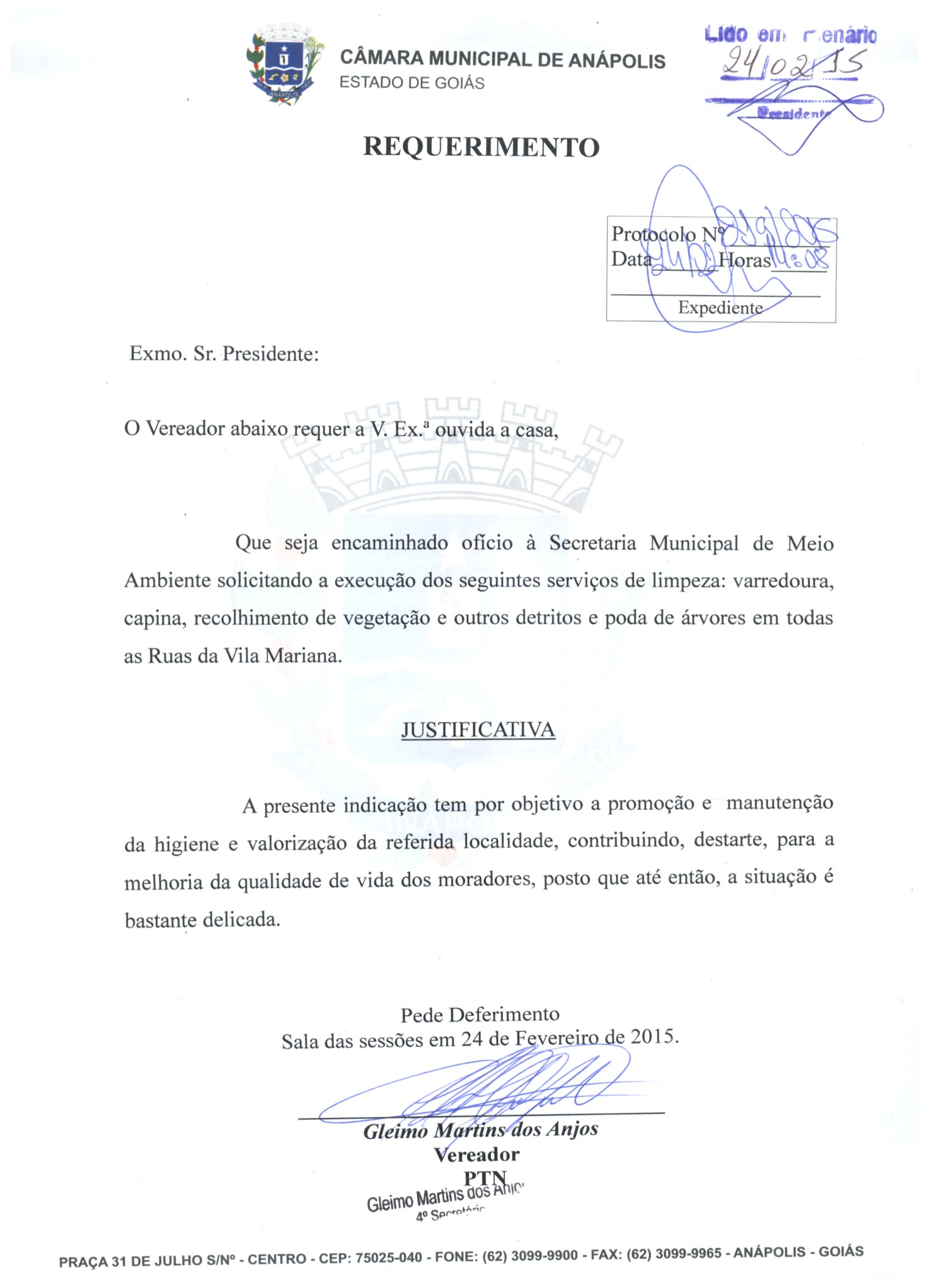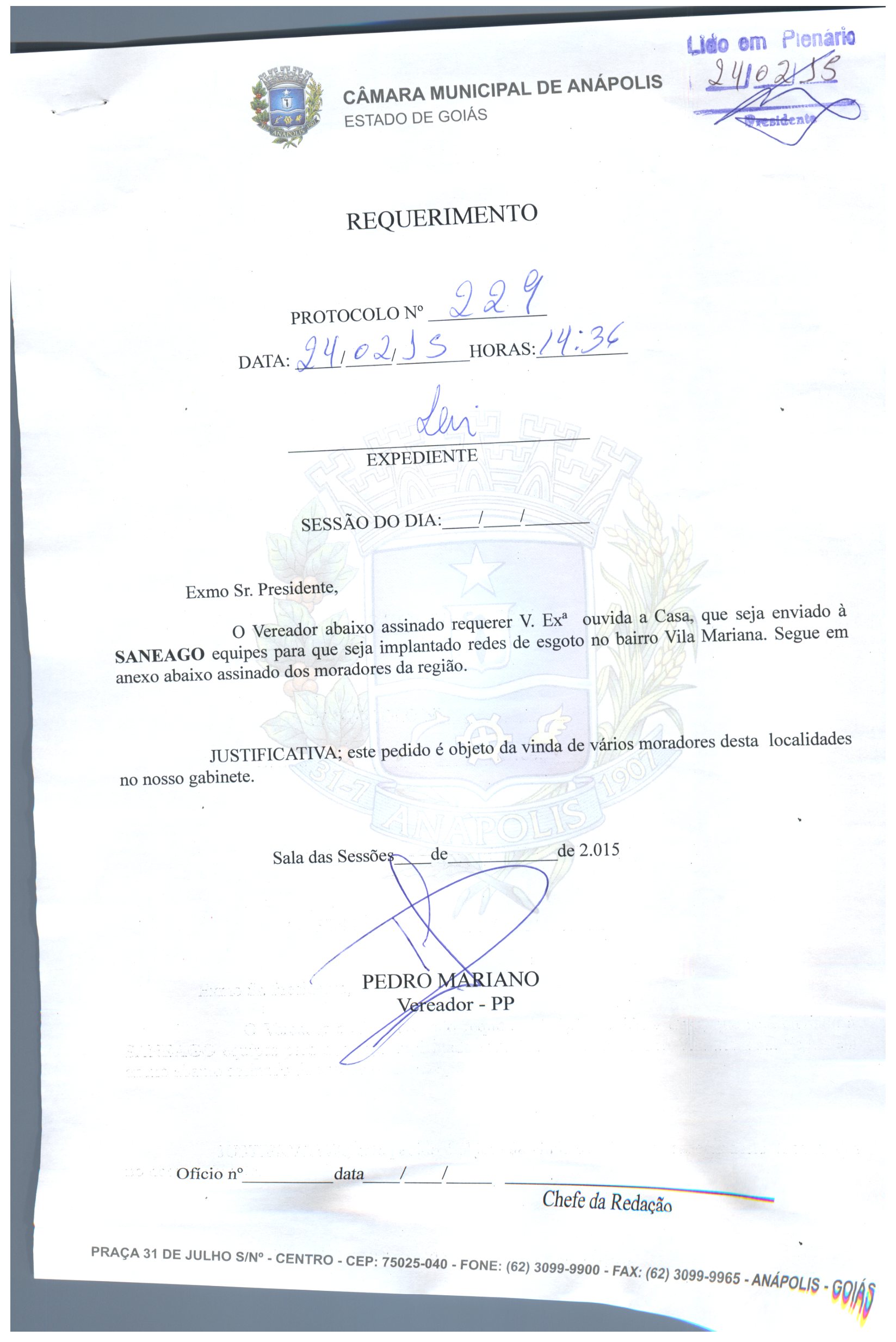 Ementa: O VEREADOR ABAIXO ASSINADO REQUER À V. EXA OUVIDA A CASA, QUE SEJA ENVIADO À SANEAGO EQUIPES PARA QUE SEJA IMPLANTADO REDES DE ESGOTO NO BAIRRO VILA MARIANA.