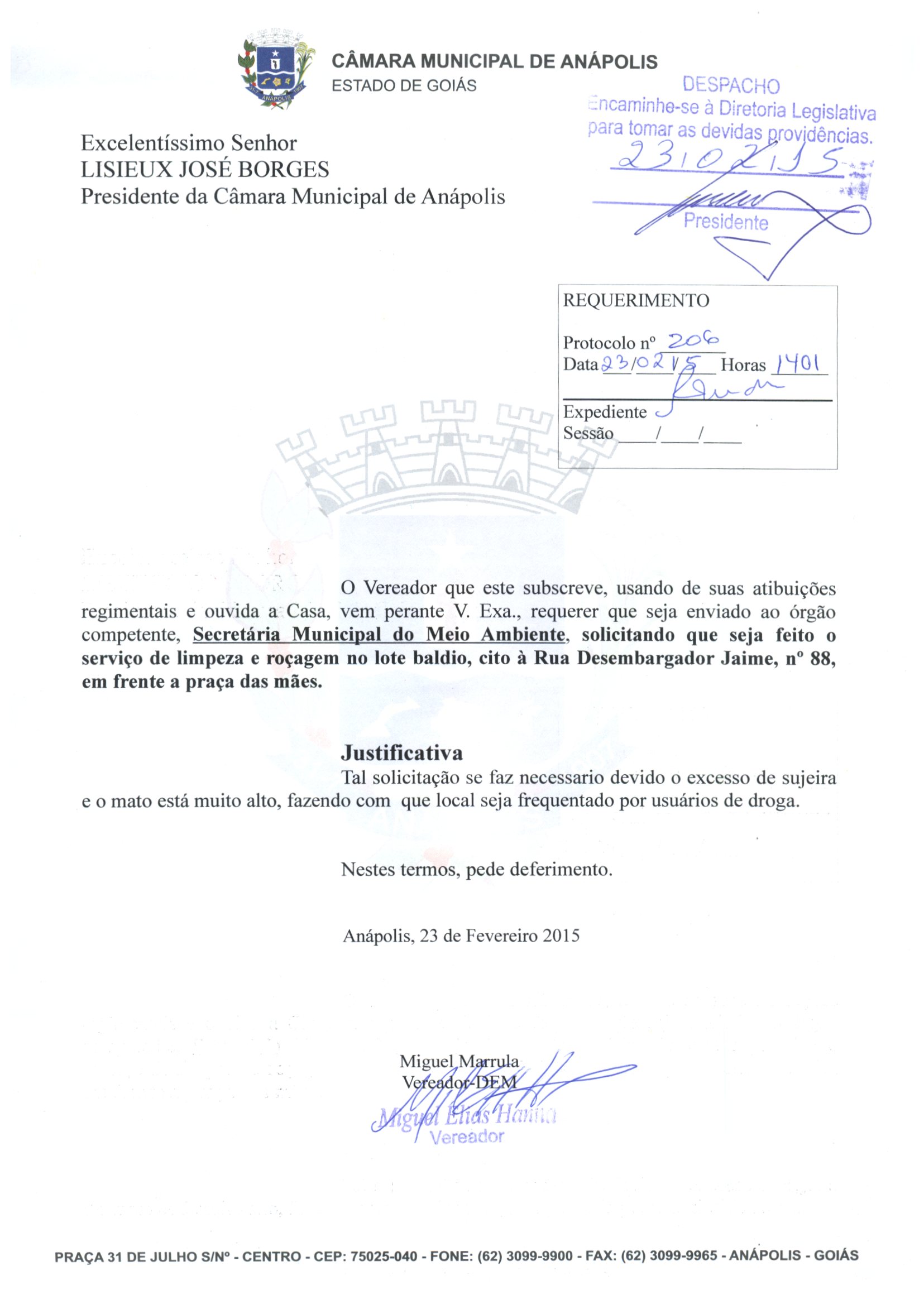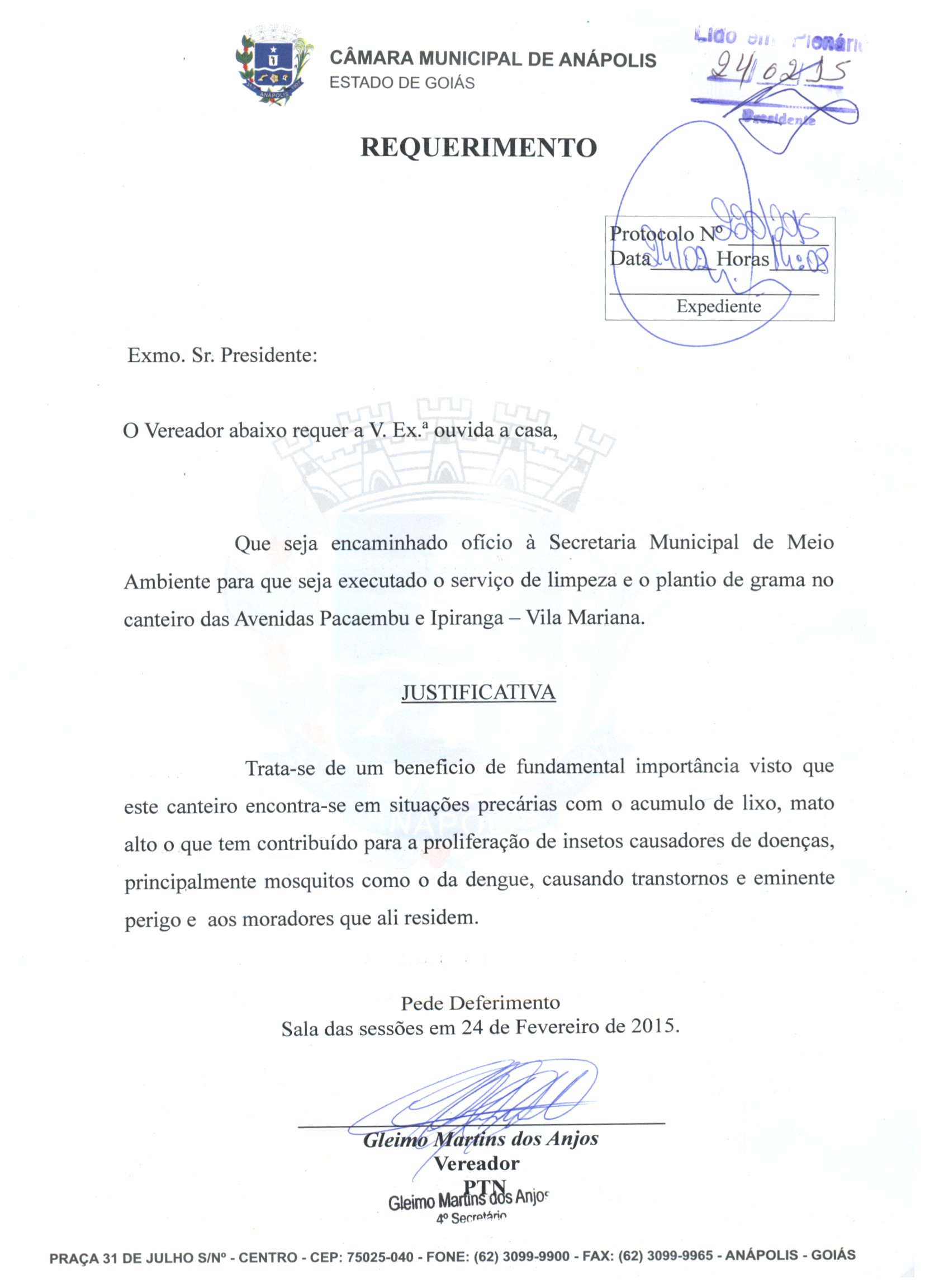 Ementa: O VEREADOR, ABAIXO ASSINADO REQUER À V.EXA. OUVIDA A CASA, QUE SEJA OFICIALIZADO À SECRETARIA MUNICIPAL DE MEIO AMBIENTE EQUIPES PARA LIMPEZA NAS MARGENS DO CÓRREGO RIBEIRÃO DAS ANTAS, BEM COMO A COLOCAÇÃO DE CERCA PARA EVITAR QUE SEJA JOGADO ALI ENTULHOS E ANIMAIS MORTOS , E LIMPEZA NAS RUAS 52 E 53 DO LOTEAMENTO SETOR SUL JAMIL MIGUEL 2ª ETAPA.