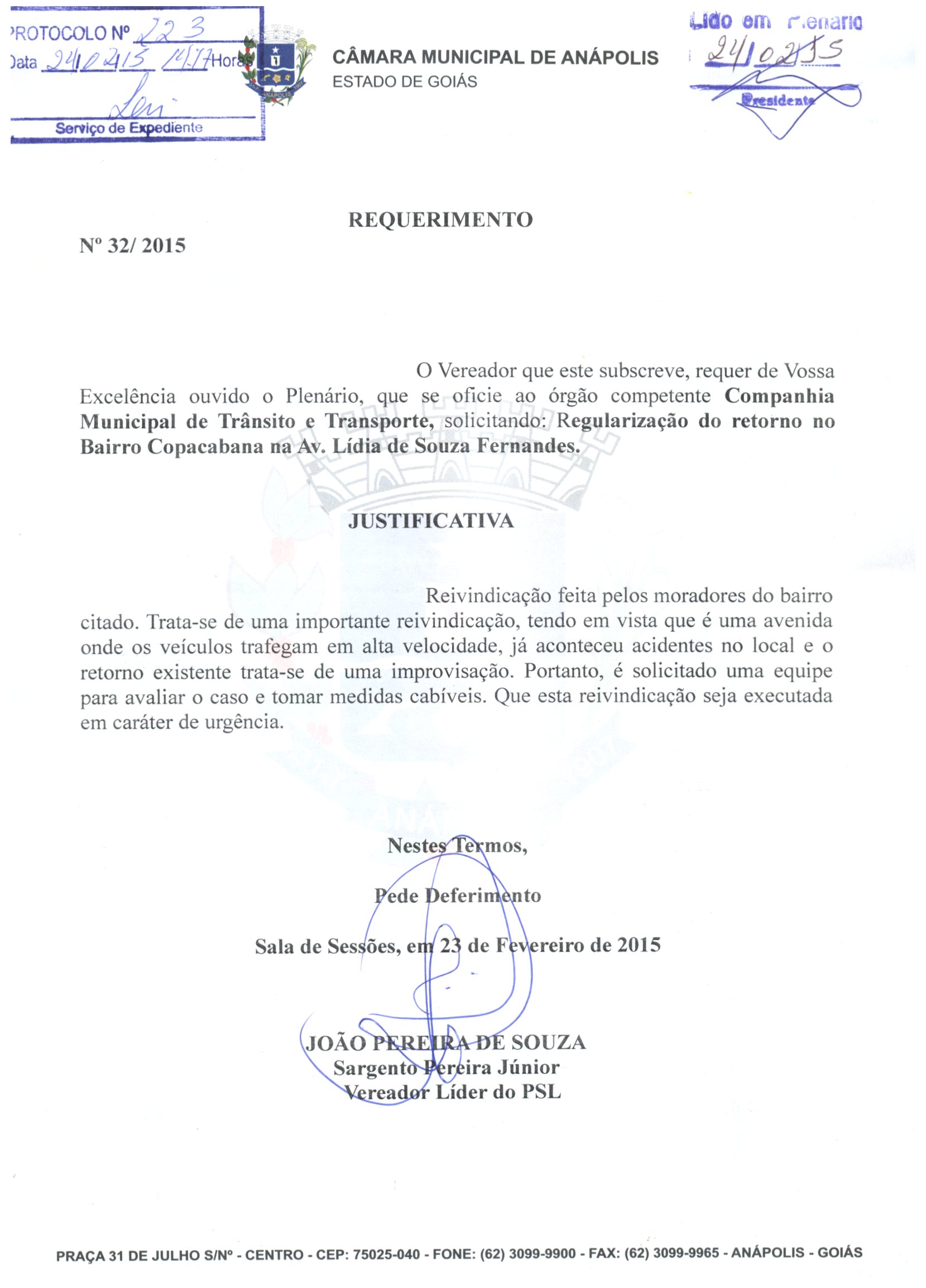 Ementa: O VEREADOR QUE ESTE SUBSCREVE, REQUER DE VOSSA EXCELÊNCIA OUVIDO O PLENÁRIO, QUE SE OFICIE AO ÓRGÃO COMPETENTE COMPANHIA MUNICIPAL DE TRÂNSITO E TRANSPORTE, SOLICITANDO: REGULARIZAÇÃO DO RETORNO NO BAIRRO COPACABANA NA AV. LÍDIA DE SOUZA FERNANDES.