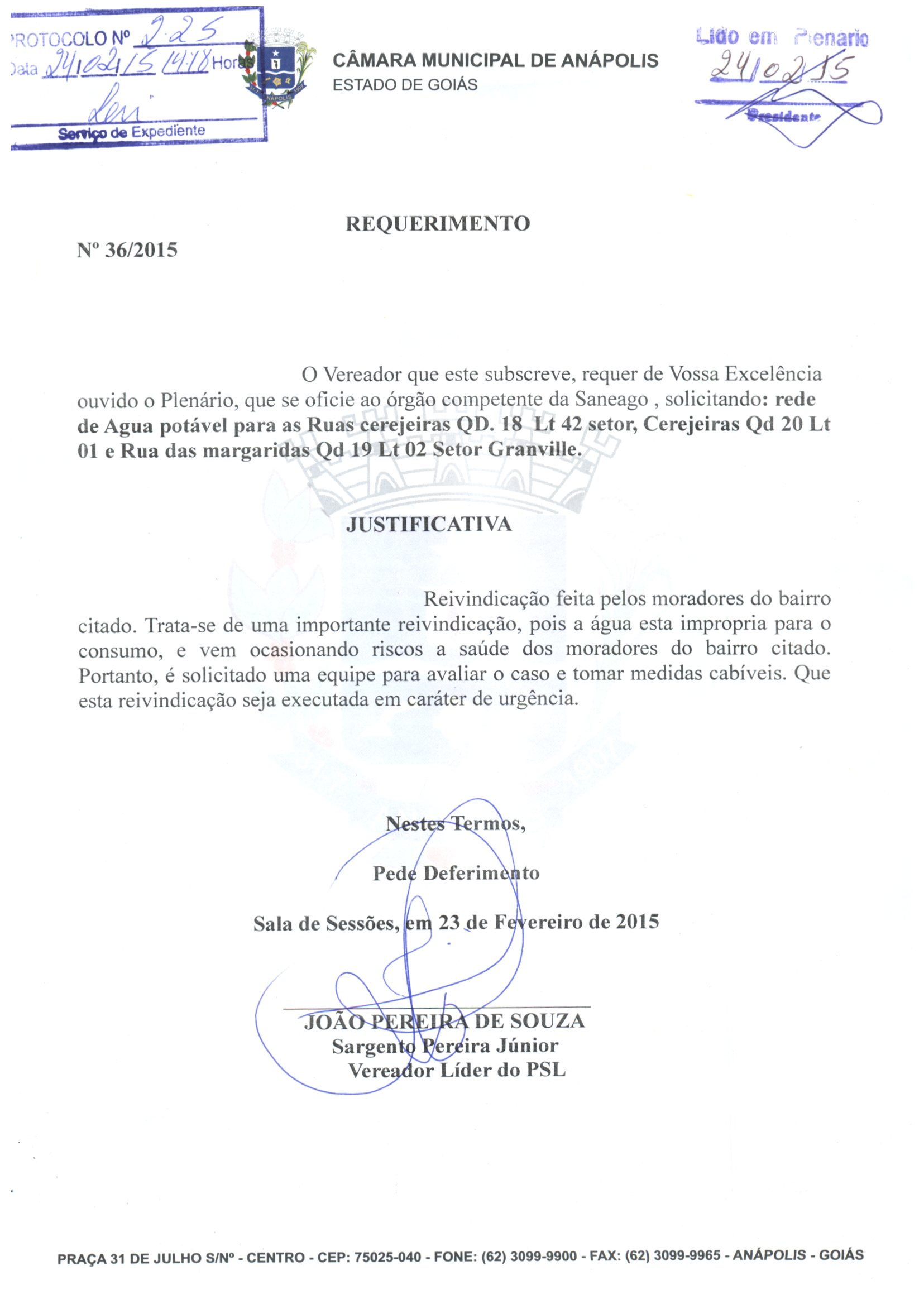 Ementa: O VEREADOR QUE ESTE SUBSCREVE, REQUER DE VOSSA EXCELÊNCIA OUVIDO O PLENÁRIO, QUE SE OFICIE AO ÓRGÃO COMPETENTE DA SANEAGO , SOLICITANDO: REDE DE ÁGUA POTÁVEL PARA AS RUAS CEREJEIRAS QD. 18, LT 42, CEREJEIRAS, QD 20, LT 01 E RUA DAS MARGARIDAS QD 19, LT 02, SETOR GRANVILLE.