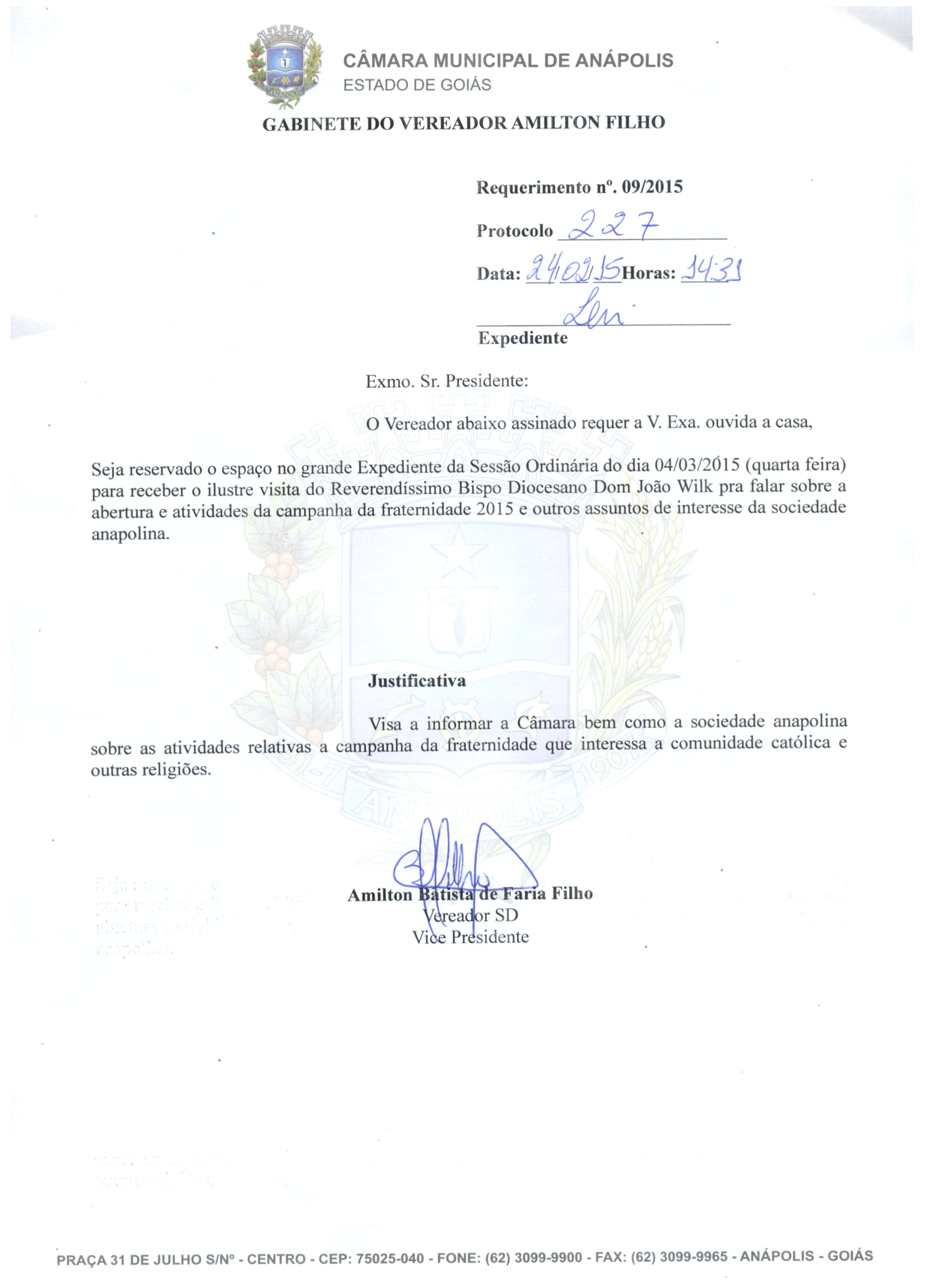 Ementa: SEJA RESERVADO O ESPAÇO NO GRANDE EXPEDIENTE DA SESSÃO ORDINÁRIA DO DIA 04/03/2015 (QUARTA FEIRA) PARA RECEBER A ILUSTRE VISITA DO REVERENDÍSSIMO BISPO DIOCESANO DOM JOÃO WILK PRA FALAR SOBRE A ABERTURA E ATIVIDADES DA CAMPANHA DA FRATERNIDADE 2015 E OUTROS ASSUNTOS DE INTERESSE DA SOCIEDADE ANAPOLINA.