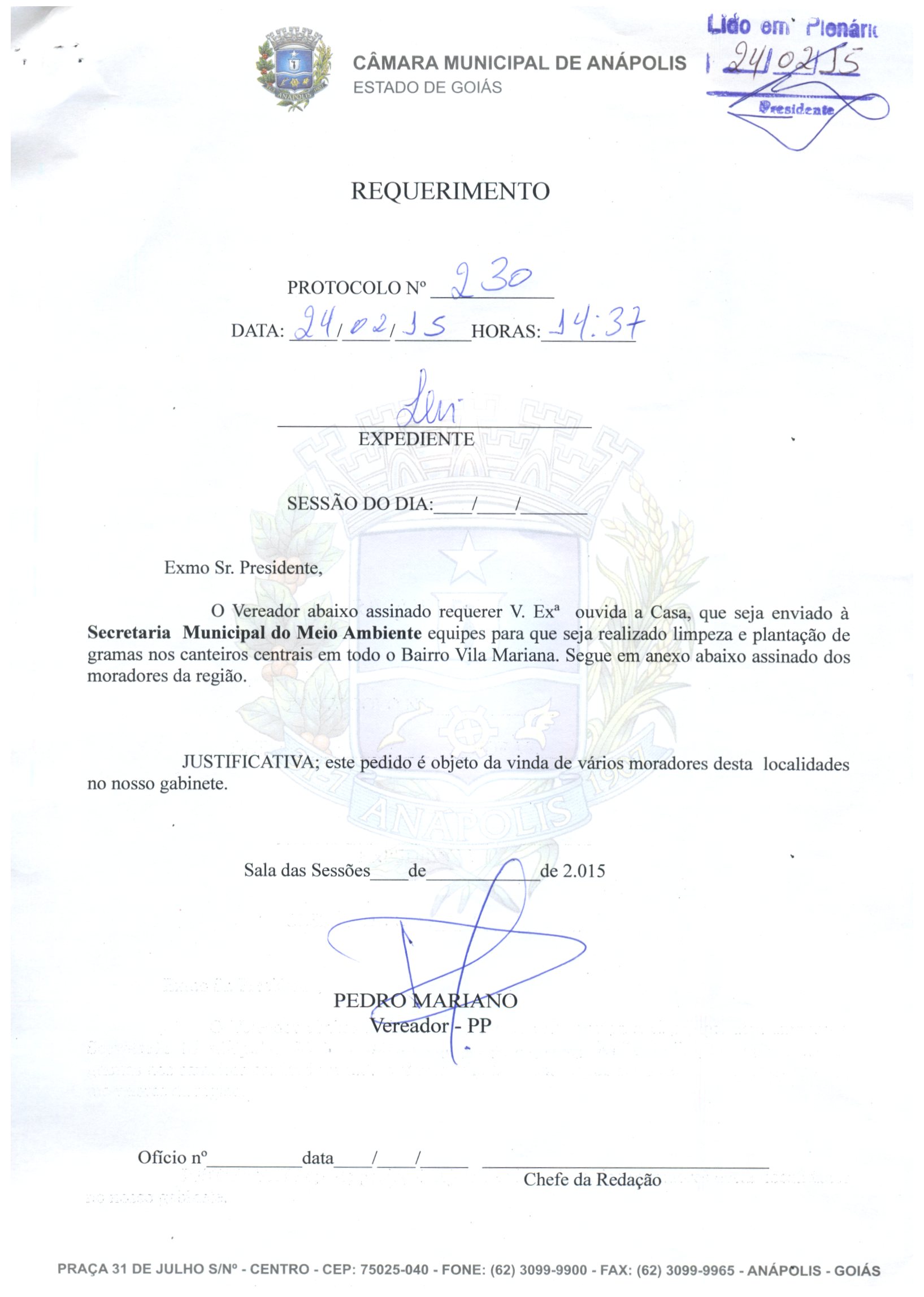 Ementa: O VEREADOR ABAIXO ASSINADO REQUER À V. EXA OUVIDA A CASA, QUE SEJA ENVIADO À SECRETARIA MUNICIPAL DO MEIO AMBIENTE EQUIPES PARA QUE SEJA REALIZADO LIMPEZA E PLANTAÇÃO DE GRAMAS NOS CANTEIROS CENTRAIS EM TODO O BAIRRO VILA MARIANA.